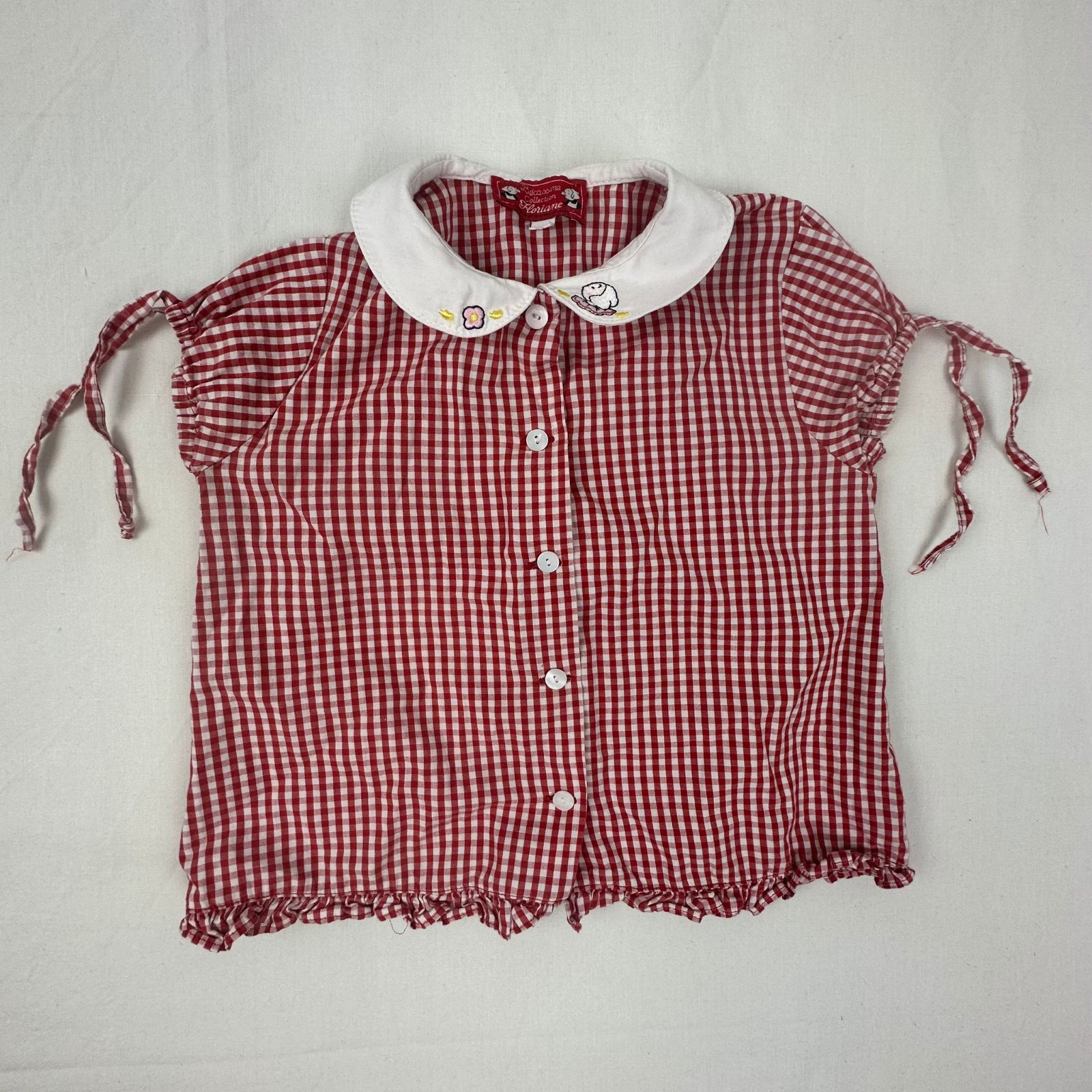 Autres commentaires : Blouse manches courtes à carreaux rouge et blanc, col claudine et une fermeture par boutons en bas.