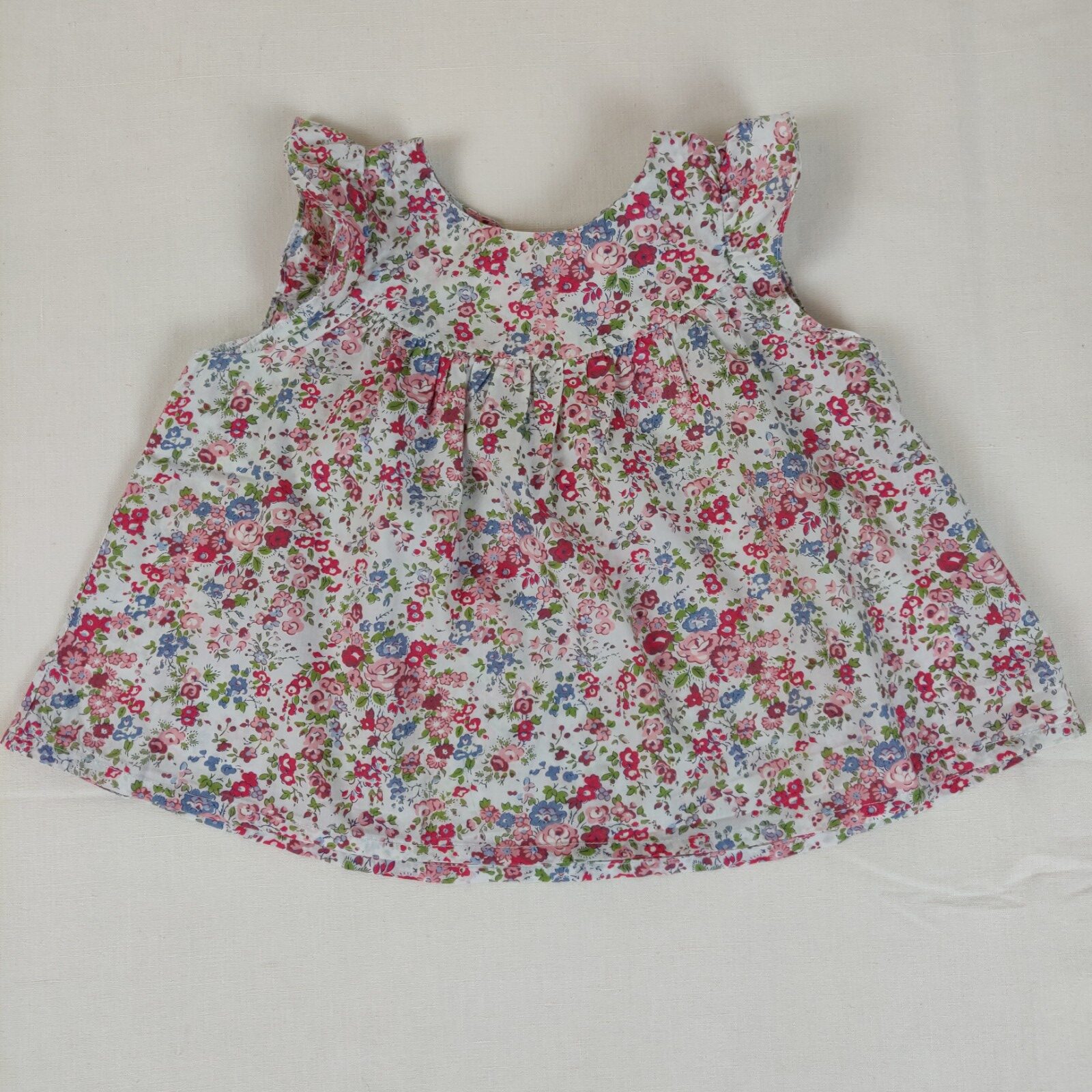 Autres commentaires : Blouse à manches courtes- écru – motif Liberty multicolore. Effet manches froncées. Ouverture centrale au dos à 2 boutons classiques nacrés (un bouton supplémentaire fourni).