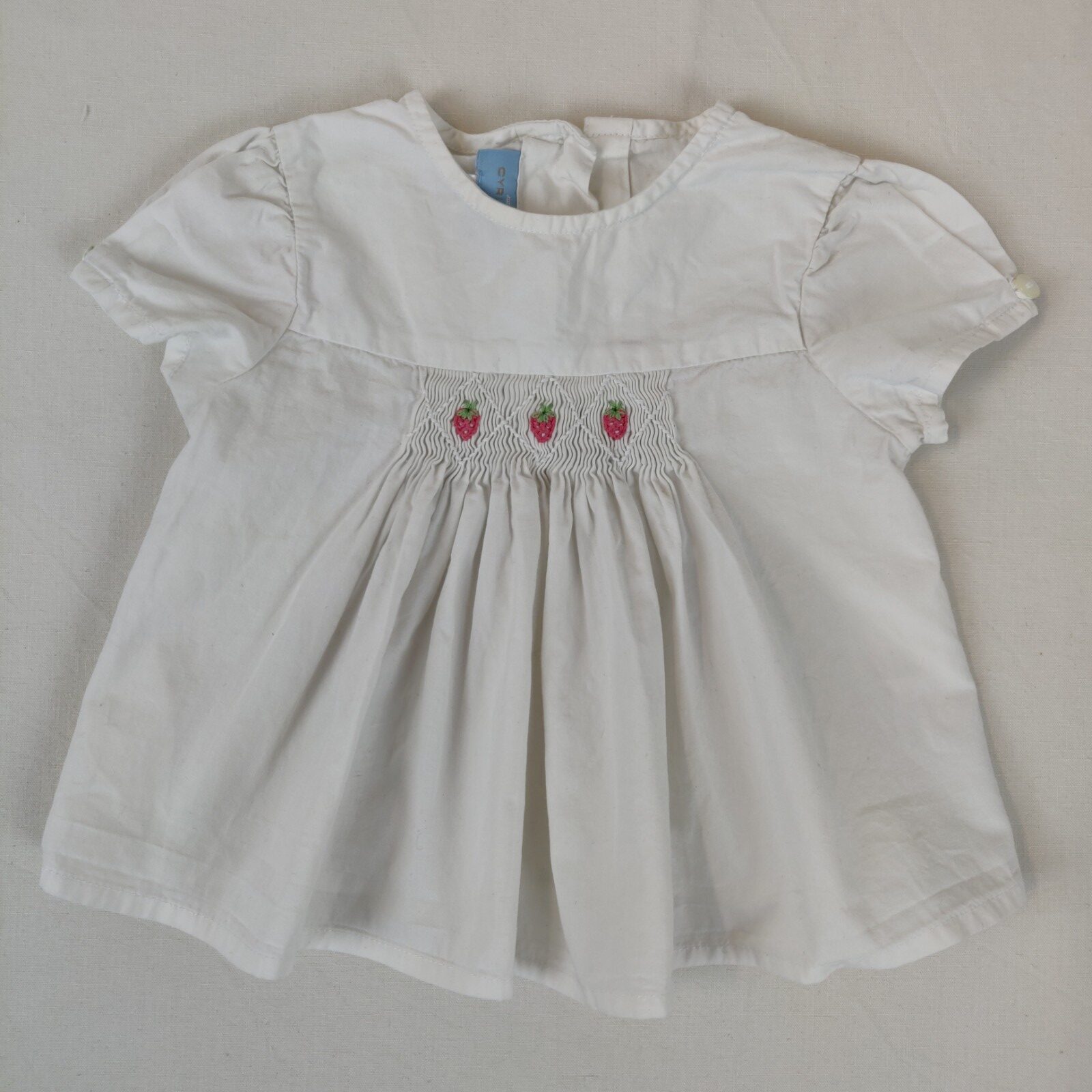 Autres commentaires : Blouse à manches courtes, col rond, smocks à la poitrine avec broderies de fraises. Fermeture par 4 boutons en nacre au dos.