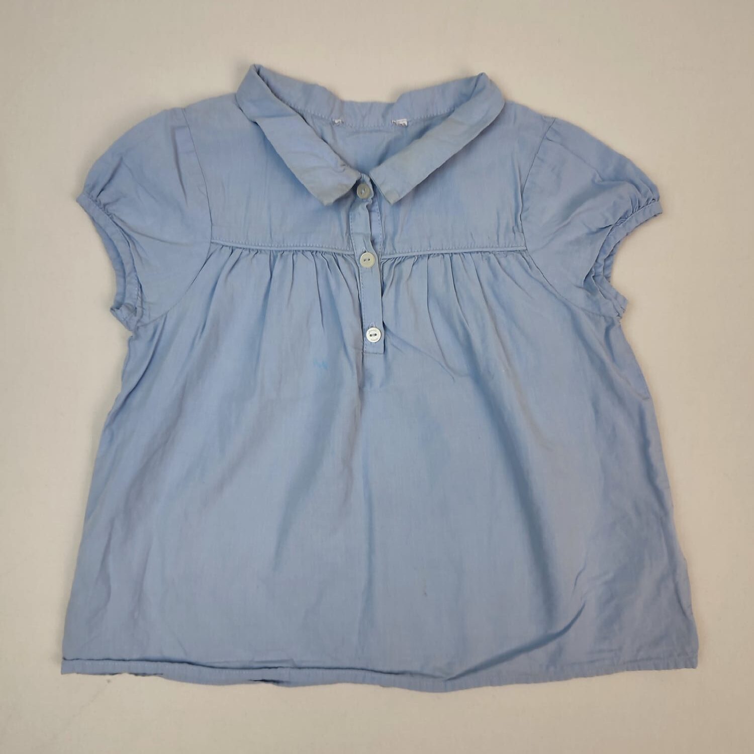 - Blouse bleu clair à manches ballon très courtes, fermeture devant par petits boutons, col chemise, forme évasée. Taches discrètes au col et sur le devant, niveau réduit de fraise à myrtille