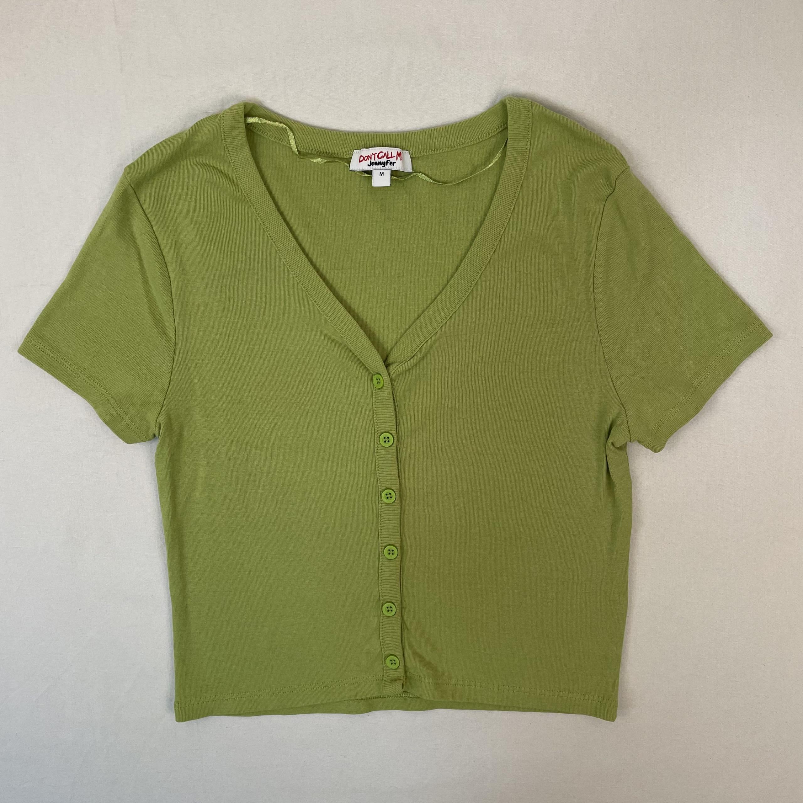 - Haut à manches courtes en jersey, uni vert anis, devant col V, fermeture devant par petits boutons. Taille M (14-16A).