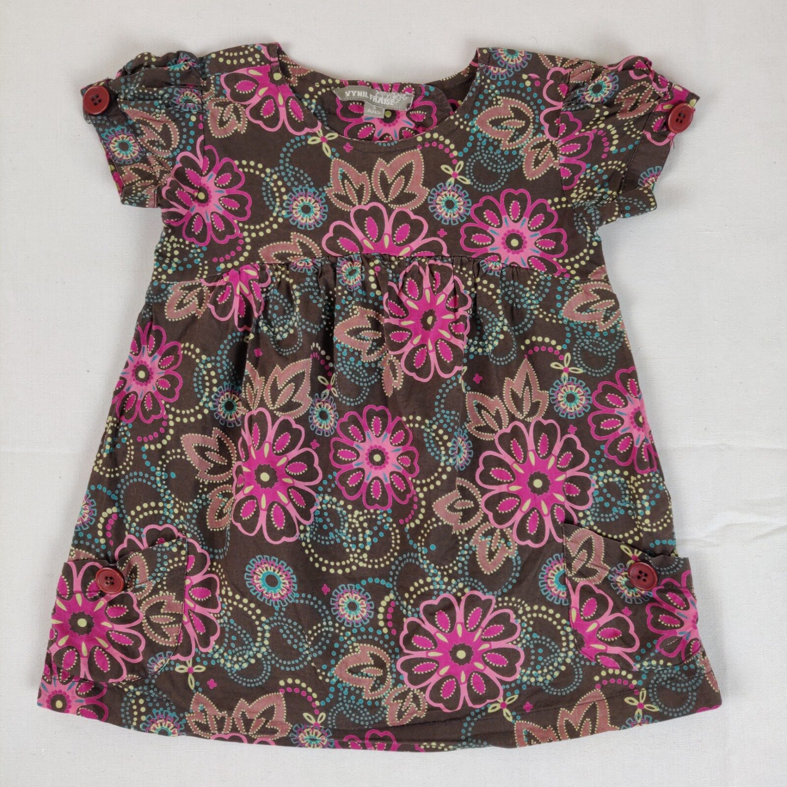 Autres commentaires : Blouse à manches courtes – marron avec motifs floraux multicolores. Ouverture à la manche à un bouton classique nacré. 2 poches latérales décorées d’un bouton classique nacré. Ouverture au dos à 2 boutons classiques nacrés en ligne laissant apparaître une légère échancure au dos.