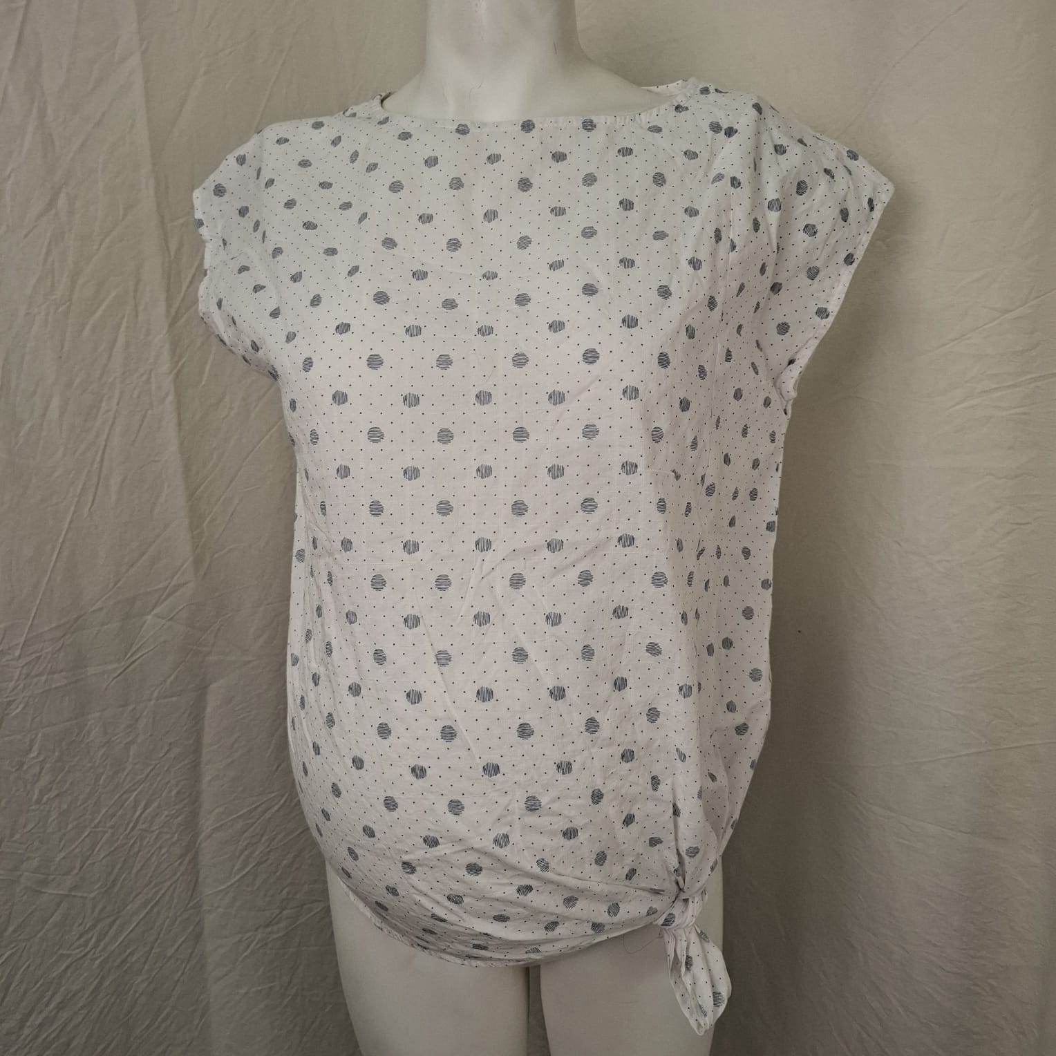 Autres commentaires : 1 % élasthanne. Blouse sans manches de maternité, blanche parsemée de mini points bleus et de sphères rayées bleues, col bateau, à nouer en bas.