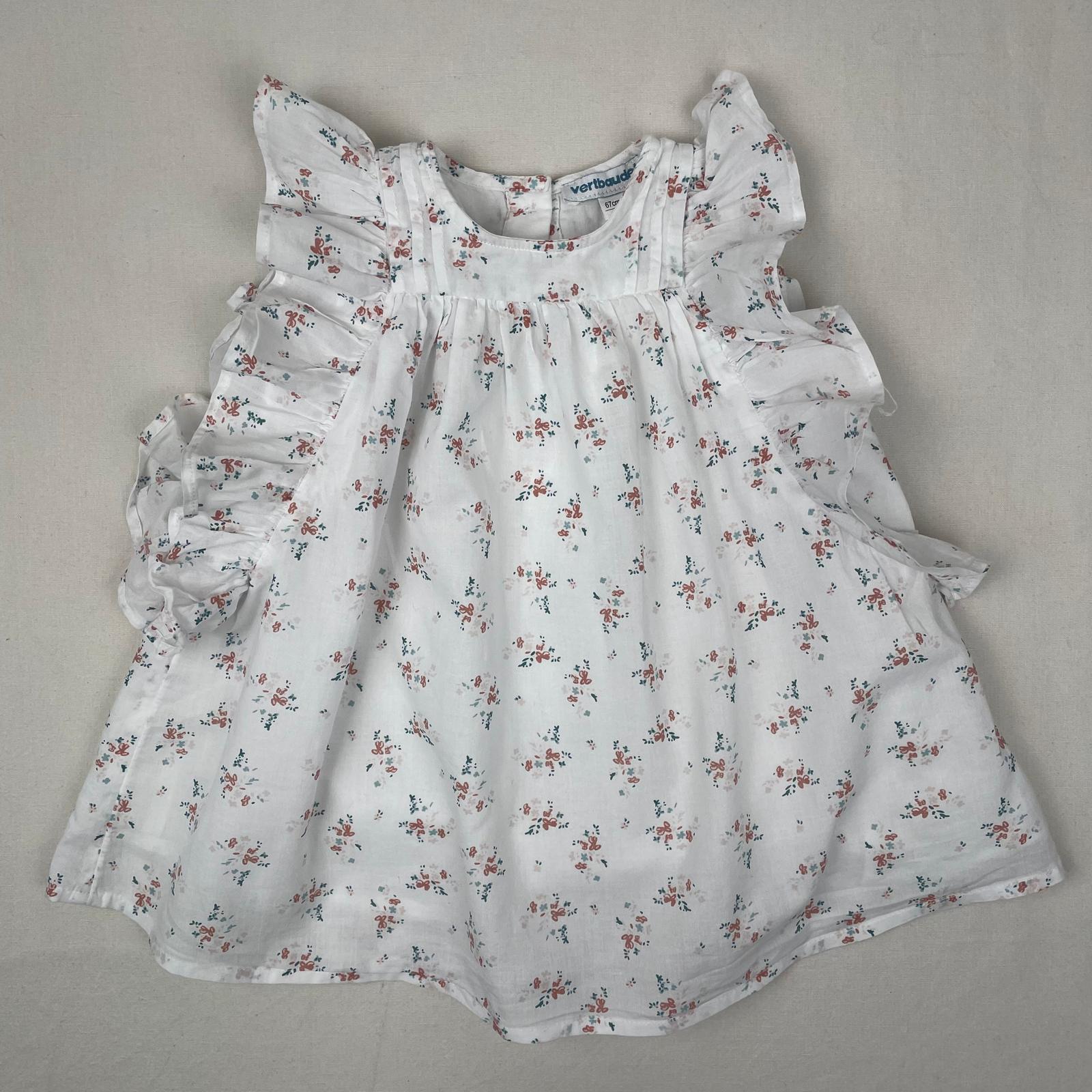 Autres commentaires : Blouse blanche à volants et imprimés fleuris. Fermeture dans le dos par des boutons