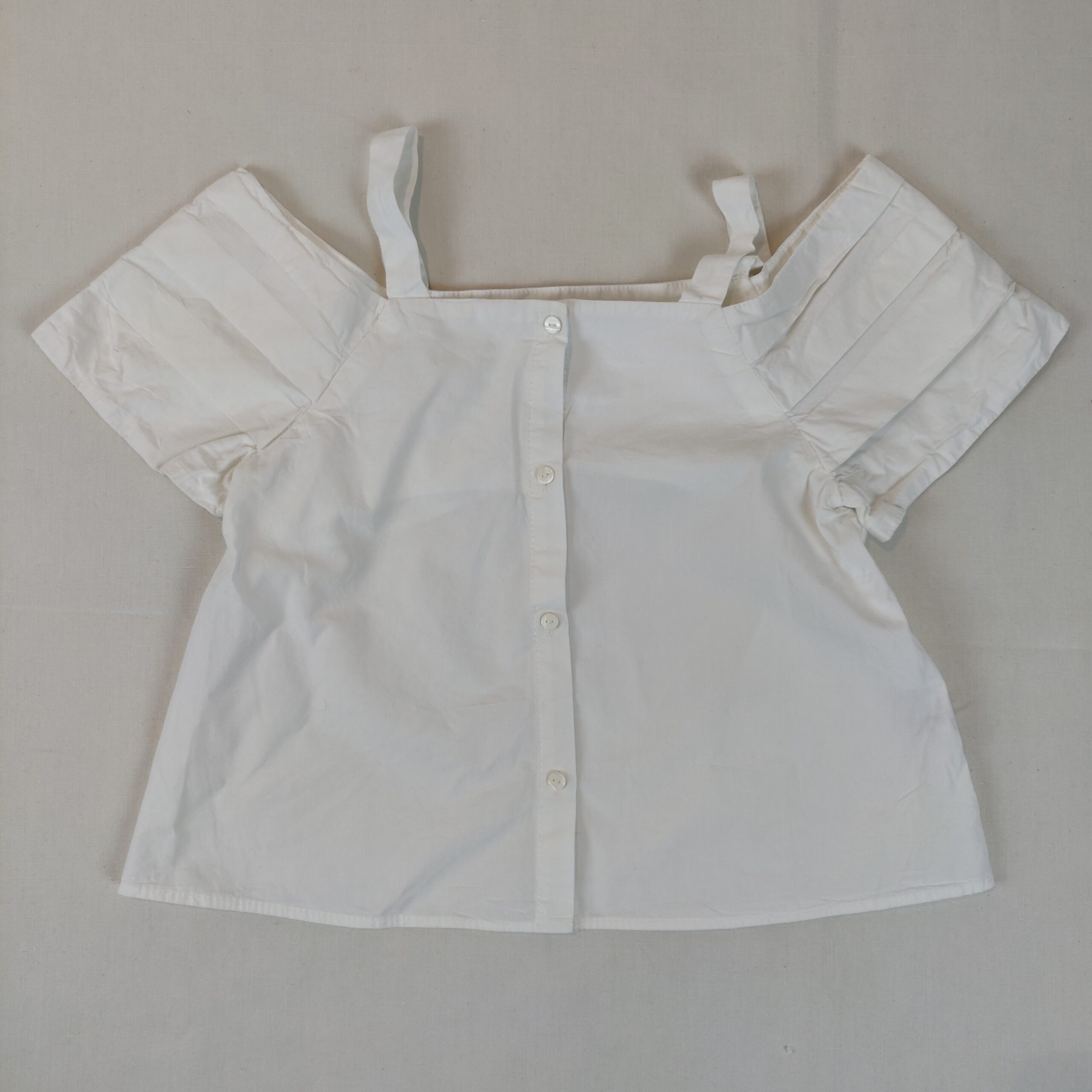 Autres commentaires : Blouse à manches courtes décalées et bretelles fines – blanc. Ouverture centrale à boutons classiques.