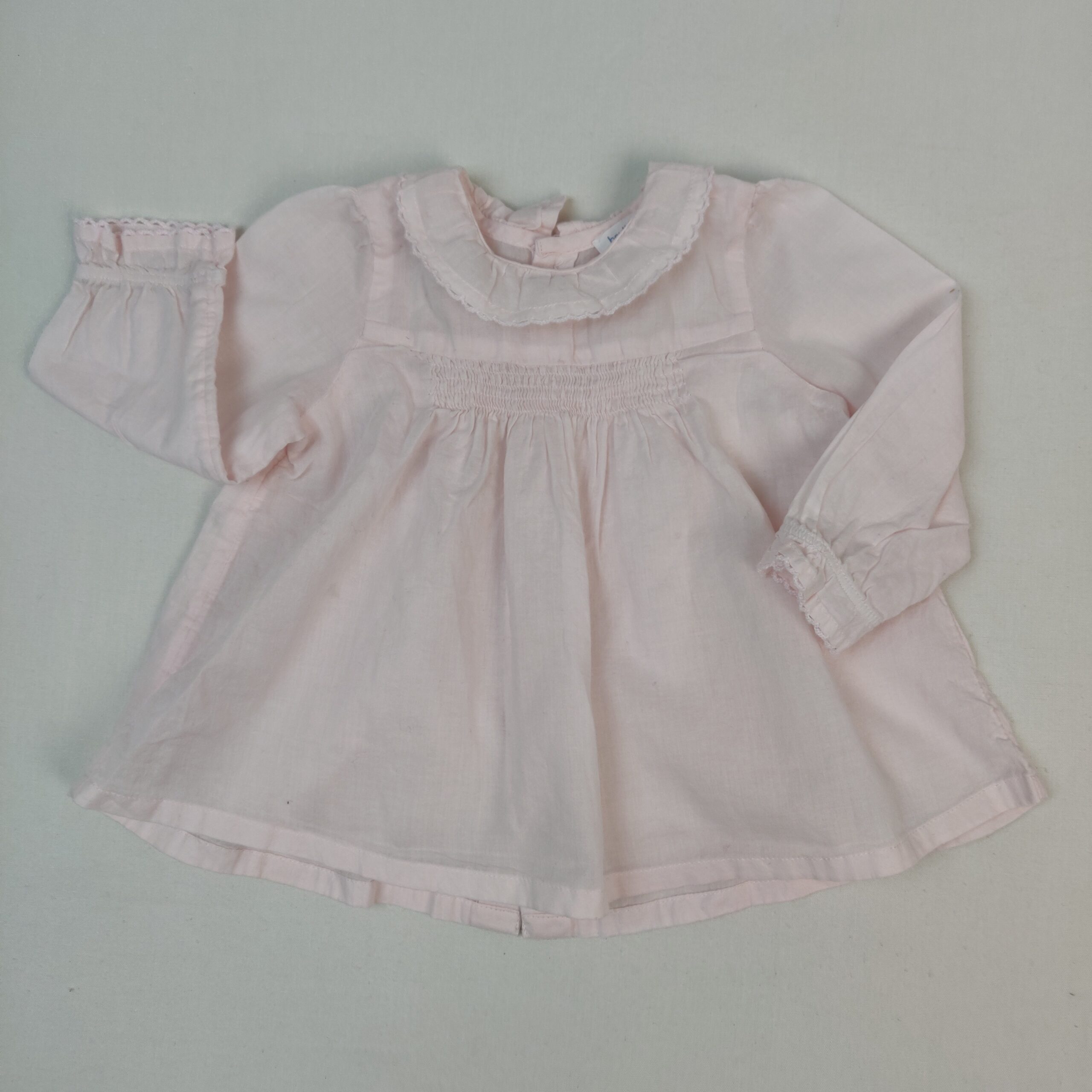 Autres commentaires : Blouse rose pâle légère, col collerete, fermeture par boutons au dos, manches longues élastiquées.