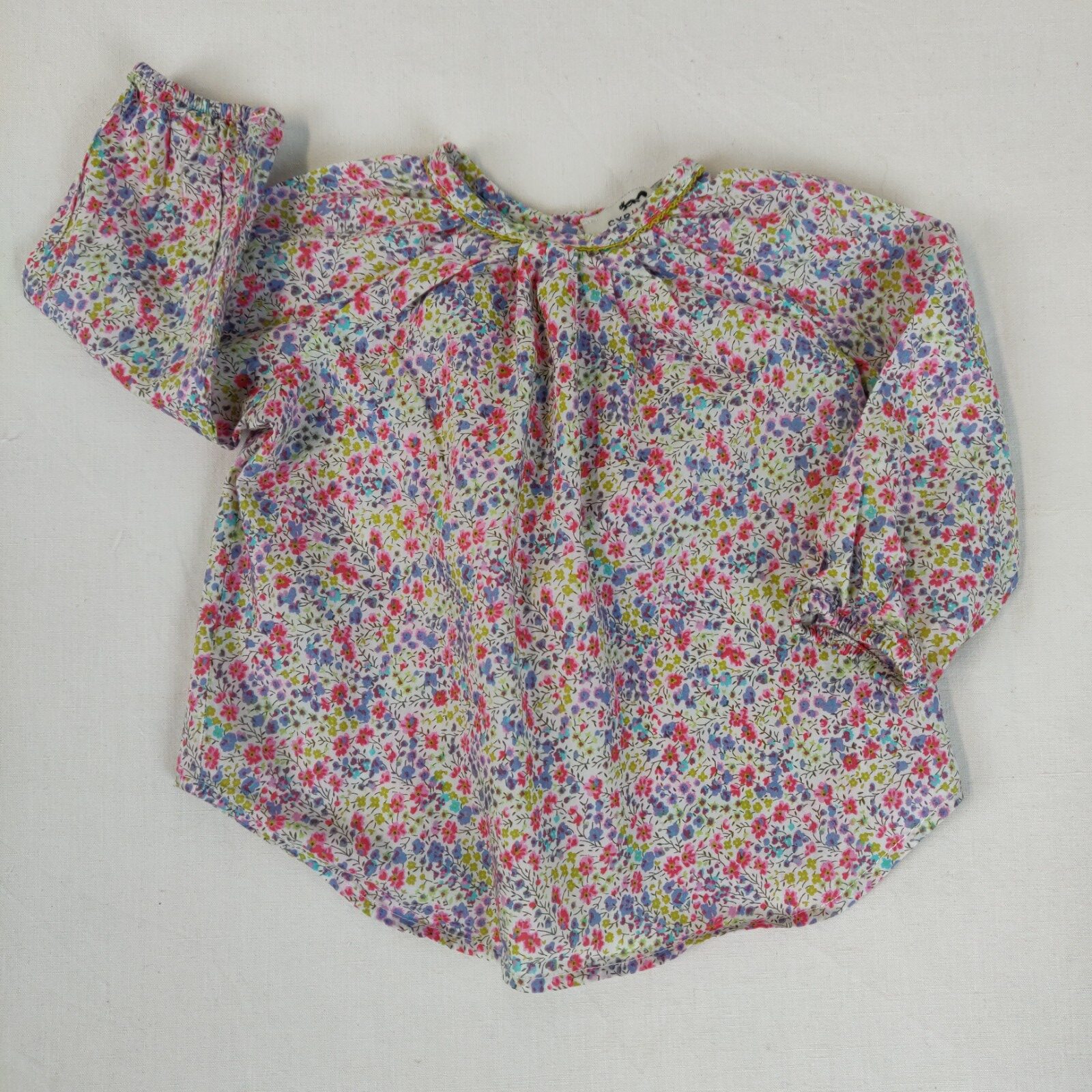 Autres commentaires : Blouse à manches longues motif liberty mutlicolore. Col rond réhaussé d’une fine dentelle jaune-vert. Poignets élastiques. Ouverture centrale au dos à boutons.