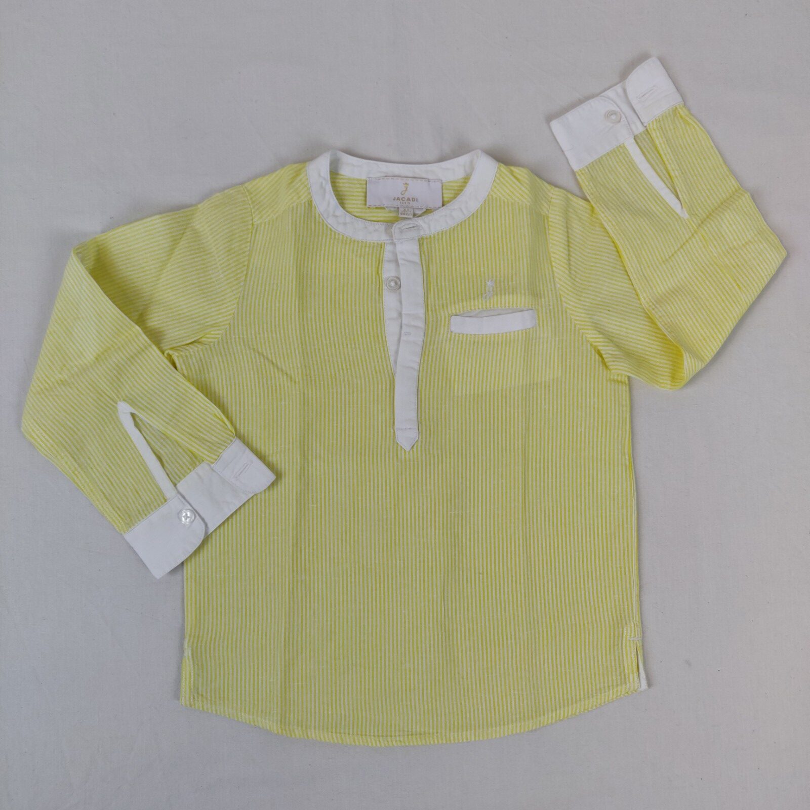 Autres commentaires : Blouse à manches longues blanche rayée jaune. Ouverture centrale à 3 boutons. Une pochette centrale surmontée du J couronné de la marque. Ouverture aux manches à un bouton.