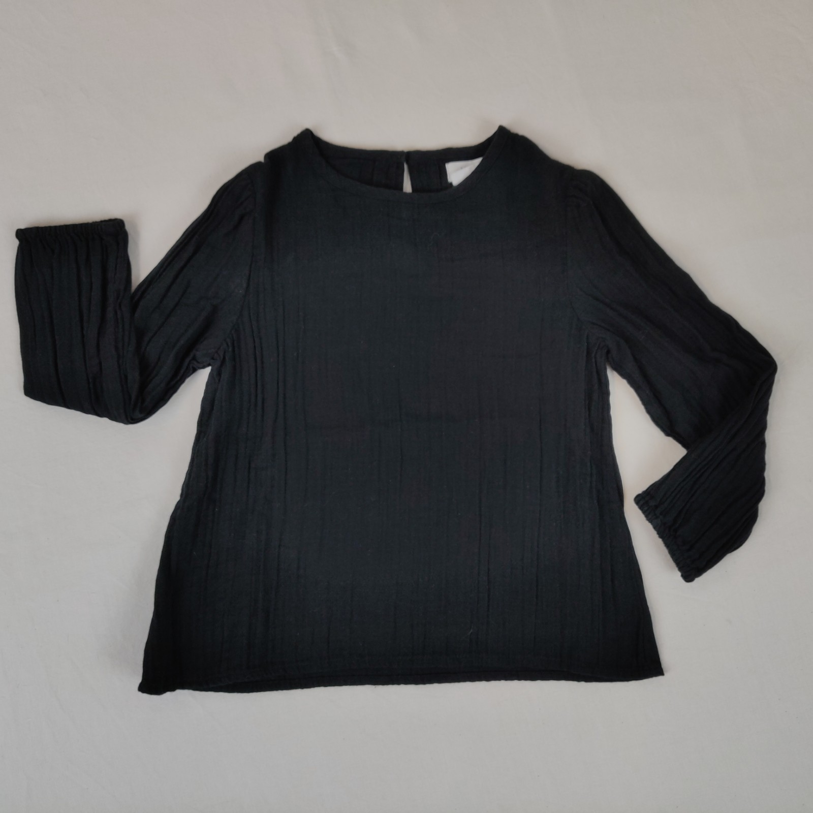 Autres commentaires : Blouse à manches longues noir avec fermeture à bouton au dos.