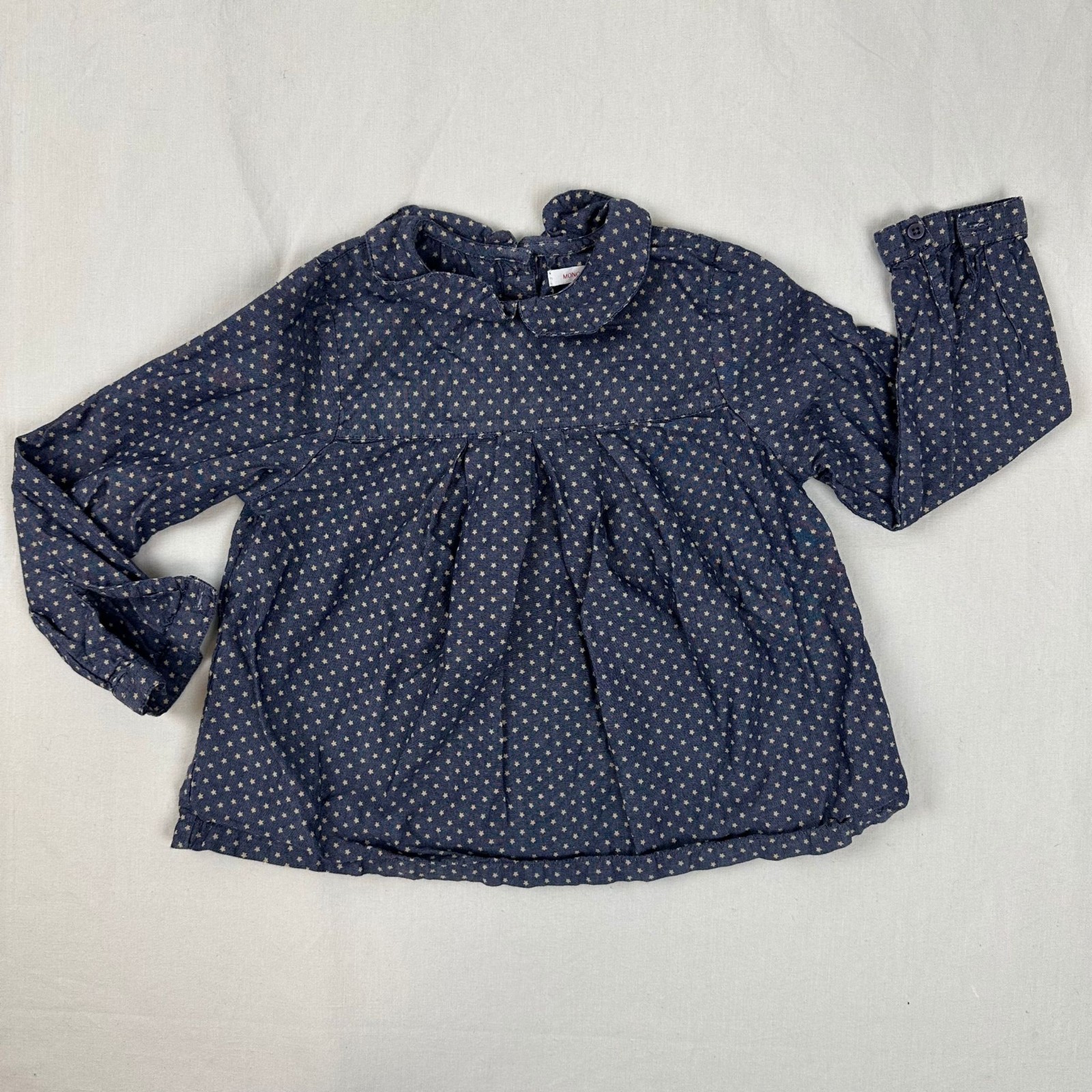 Autres commentaires : Blouse manches longues bleu étoilée en blanc, col claudine avec une fermeture au dos par boutons.