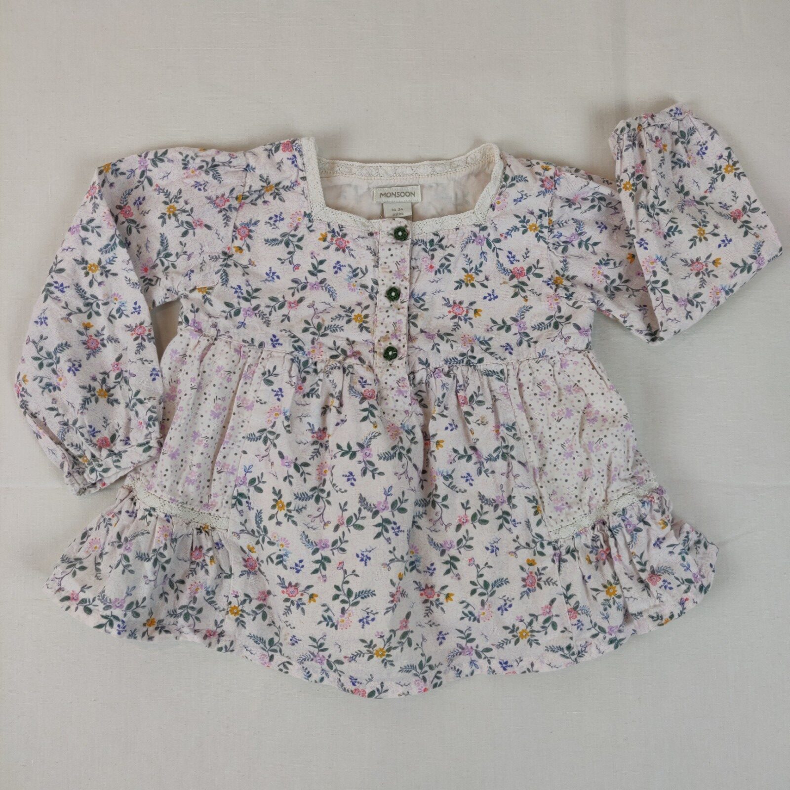 Autres commentaires : Blouse doublée manches longues – rose pâle avec motifs floraux multicolores. Col carré avec bordure en dentelle blanche. Ouverture centrale à partir du col à 3 boutons classiques. Tâches très discrètes marrons qui se fondent dans le motif. Niveau réduit.