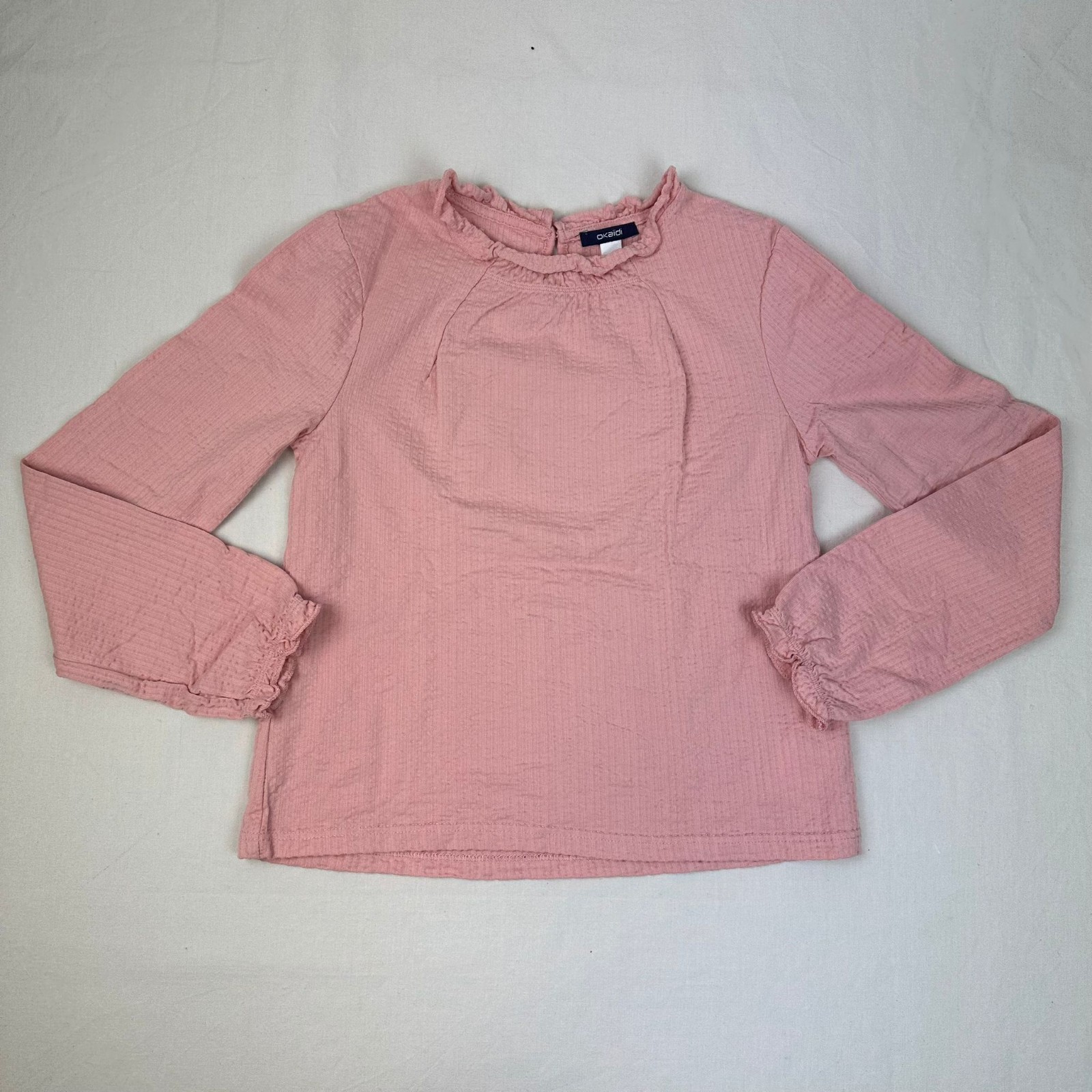 Autres commentaires : Blouse manches longues rose avec une fermeture au dos par un bouton.