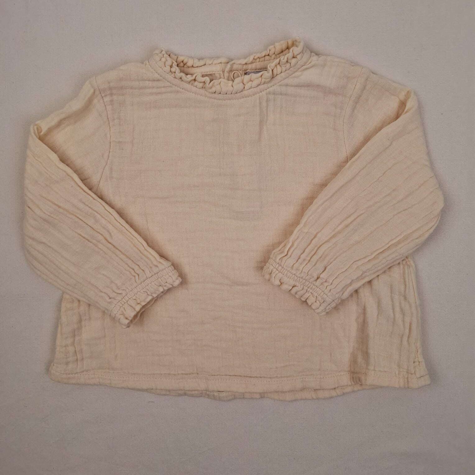 Autres commentaires : T-shirt blanc chaud en gaze de coton à manches longues, aspect gaufré, fermeture devant par boutons pression, col volanté, poignets elastiqués.