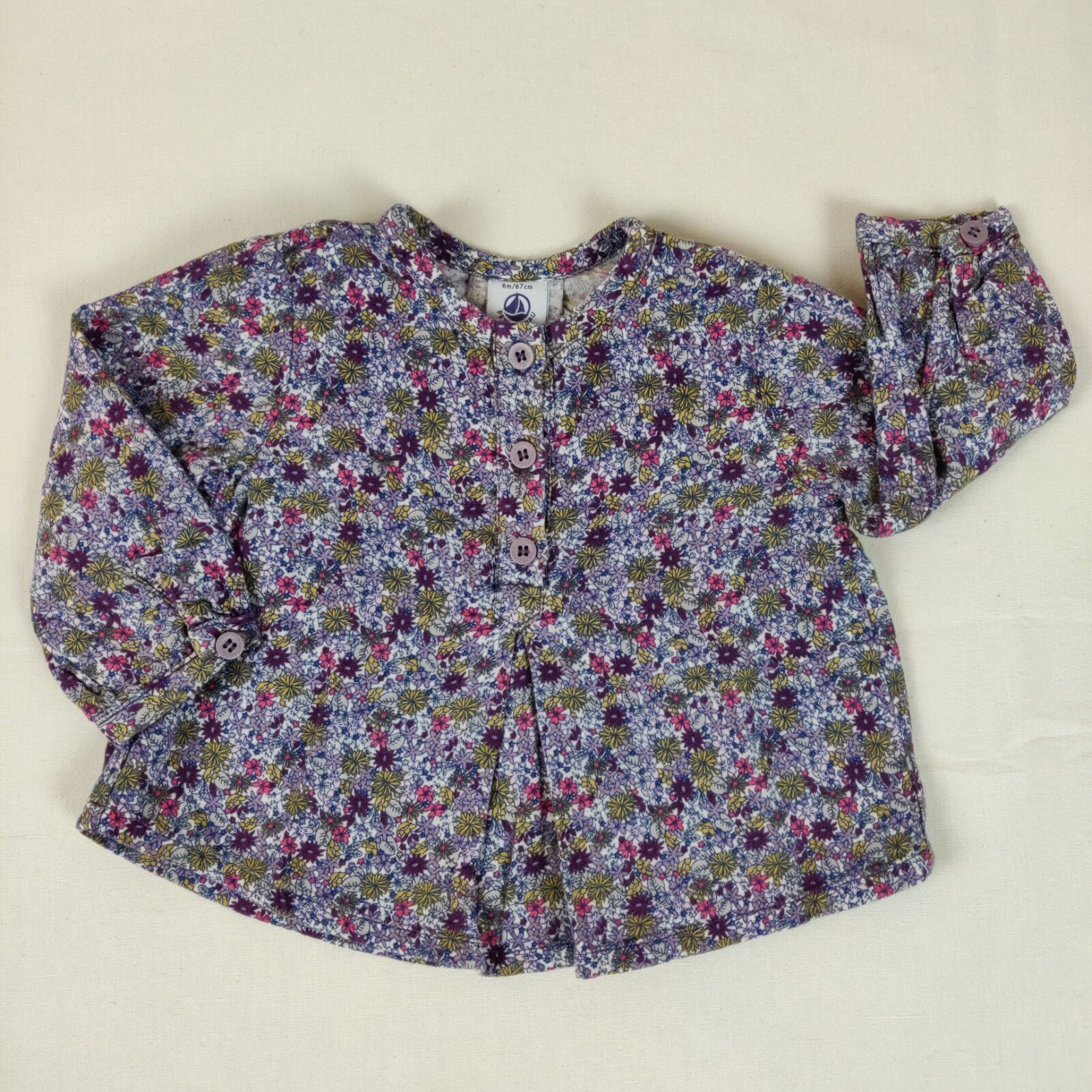 Autres commentaires : Blouse à manches longues motif liberty parme, violet, rose et jaune. Ouverture centrale à 3 boutons parmes. Ouverture aux poignets à un bouton parme.