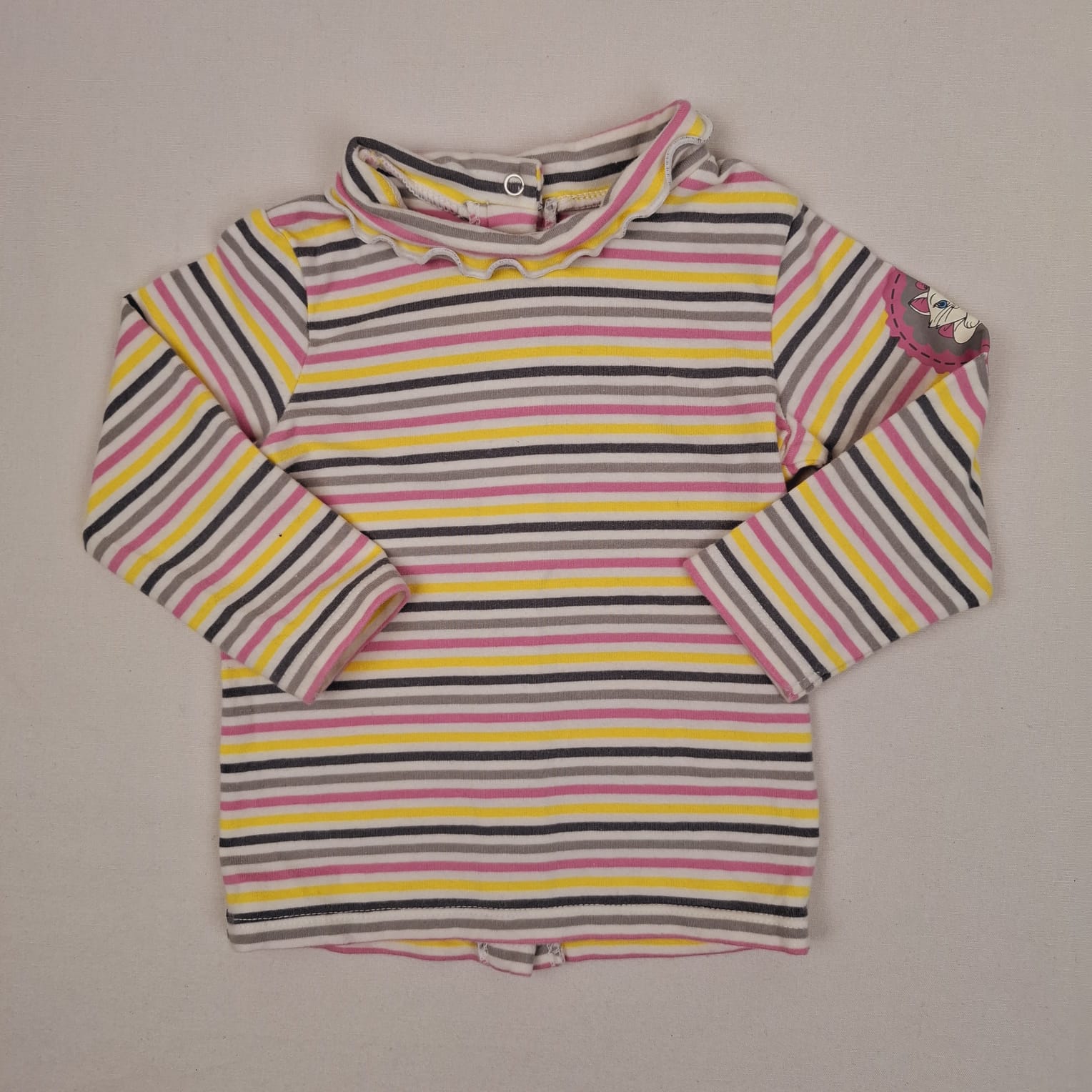Autres commentaires : Blouse à rayures blanc, gris, rose, bleu foncé, col roulé, illustration d’un chat de Disney sur le bras gauche.