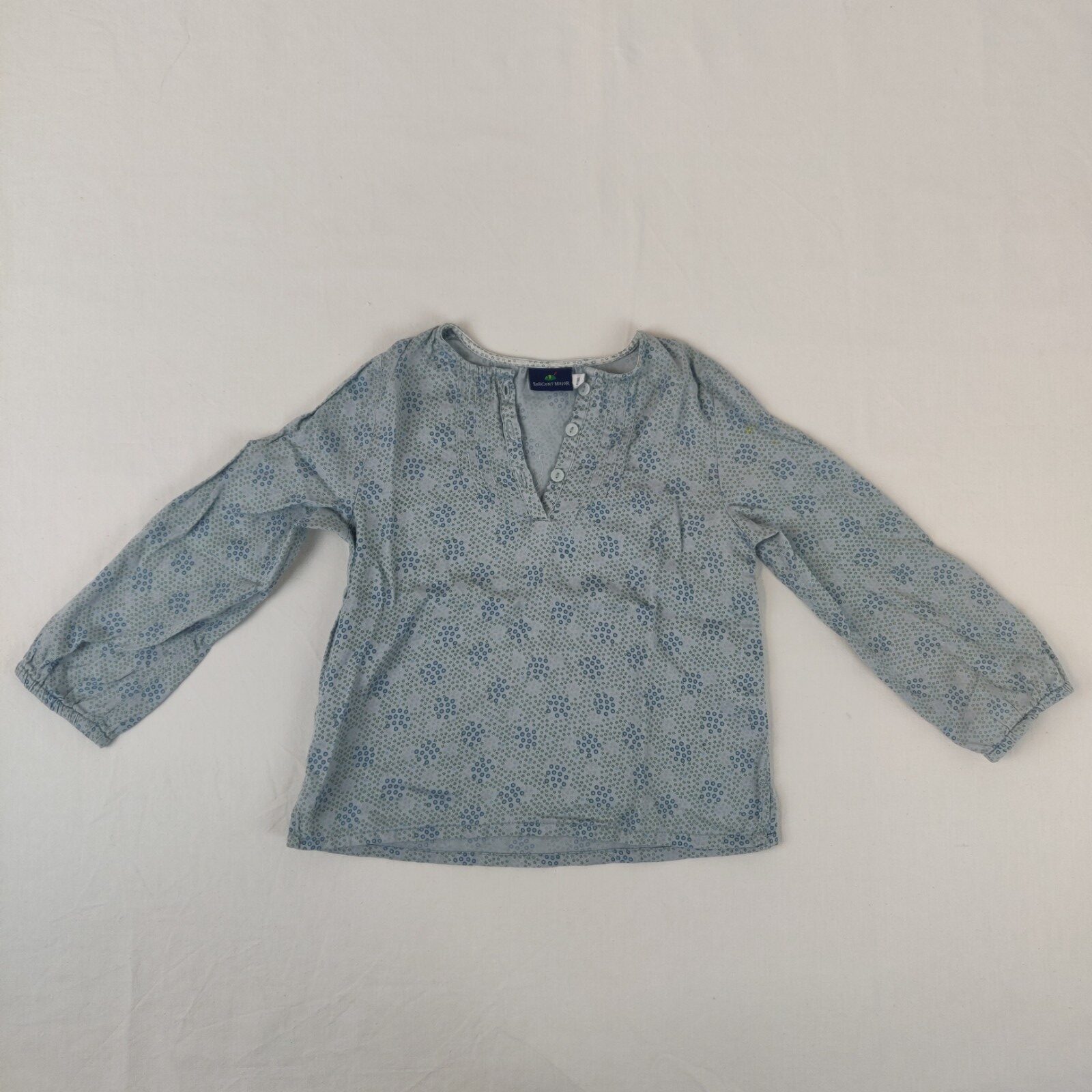 Autres commentaires : Blouse à manches longues – bleu-gris. Motifs floraux bleus et verts. Ouverture centrale à 3 botuons. 2 petites tâches de peinture jaune au niveau de la manche gauche. Niveau réduit de fraise à myrtille.