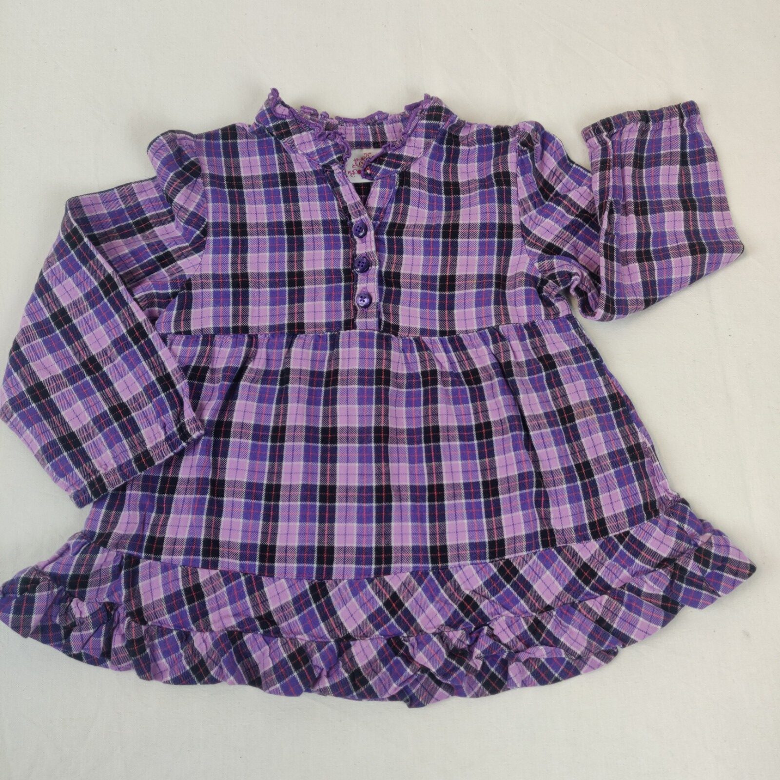 Autres commentaires : Blouse à manches longues à motif écossais violet, parme, noir, rouge et blanc. Taille marquée. Ouverture centrale à 3 boutons. Le bas de la blouse est volanté. Poignets élastiques.