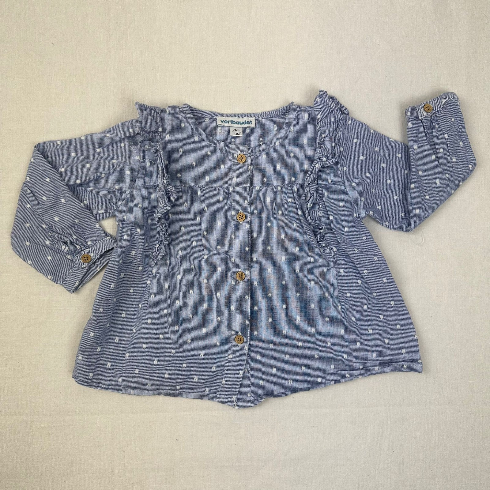 Autres commentaires : Blouse bleu manches longues avec points blanc et une fermeture devant par boutons.