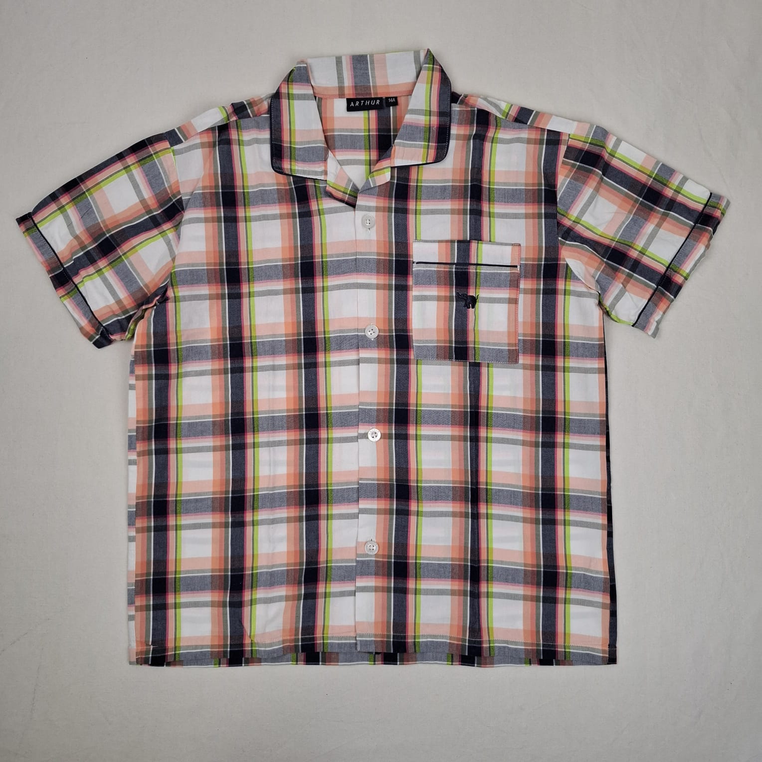 Autres commentaires : Chemise à manches courtes, écossais multicolore, fermeture devant par boutons, liseré surpiqué au niveau des manches, petite poche au niveau de la poitrine avec un mini éléphant bleu.