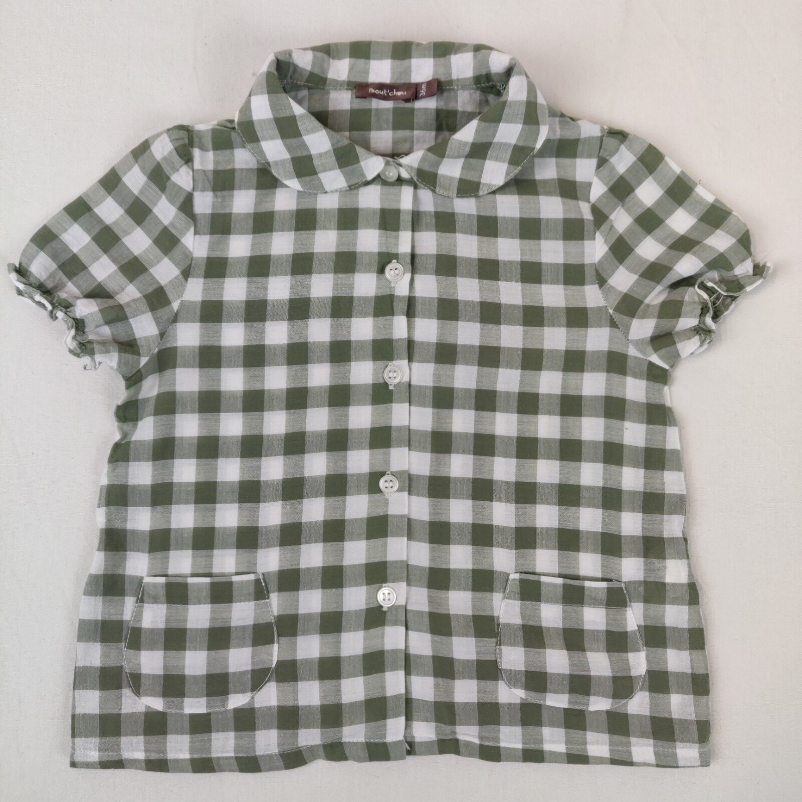 Autres commentaires : Chemise à manches courtes légèrement bouffantes à carreaux blancs et vert kaki. Ouverture centrale à boutons. 2 poches centrales.