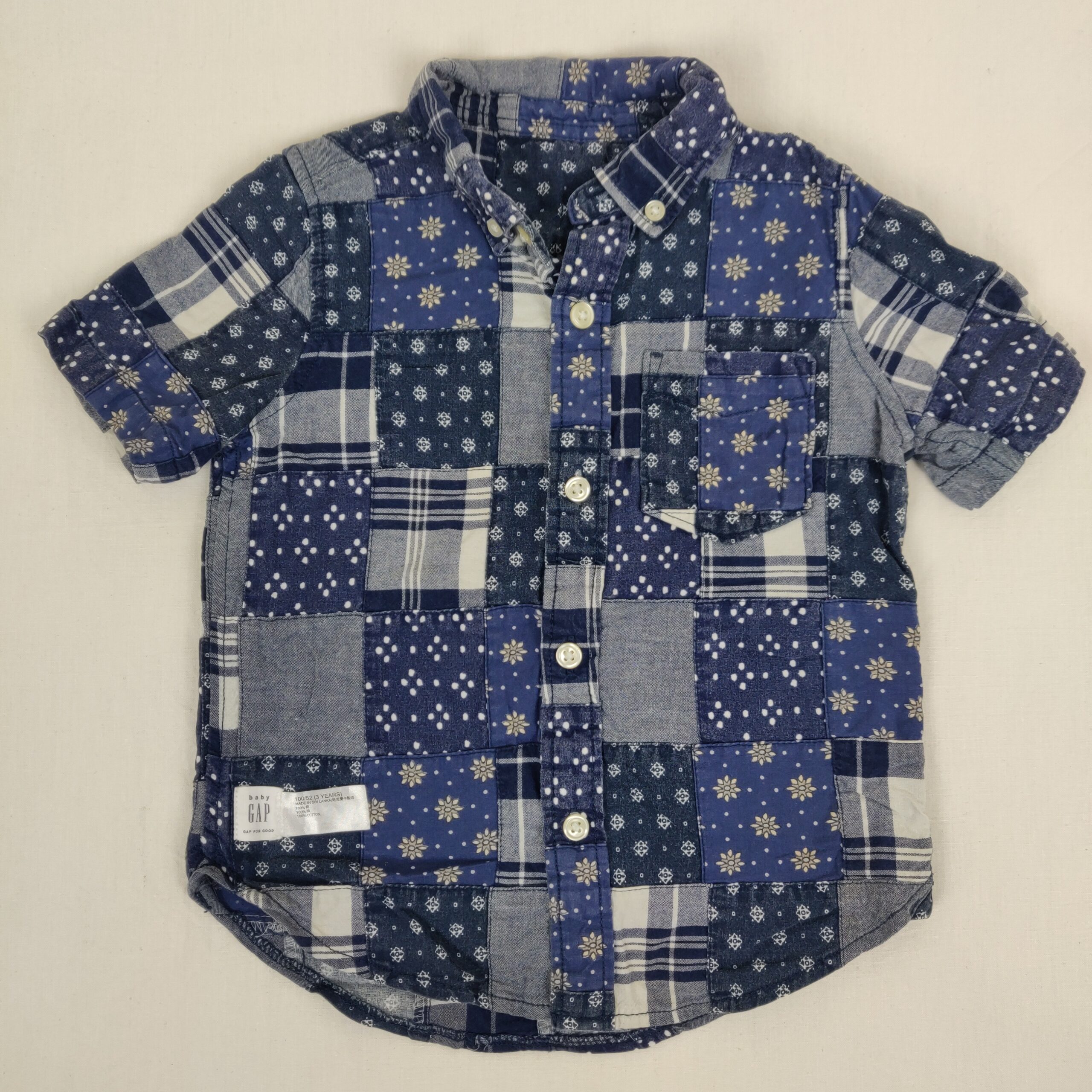 Autres commentaires : Chemise manches courtes, en patchwork de toiles de coton bleu marine et blanc.