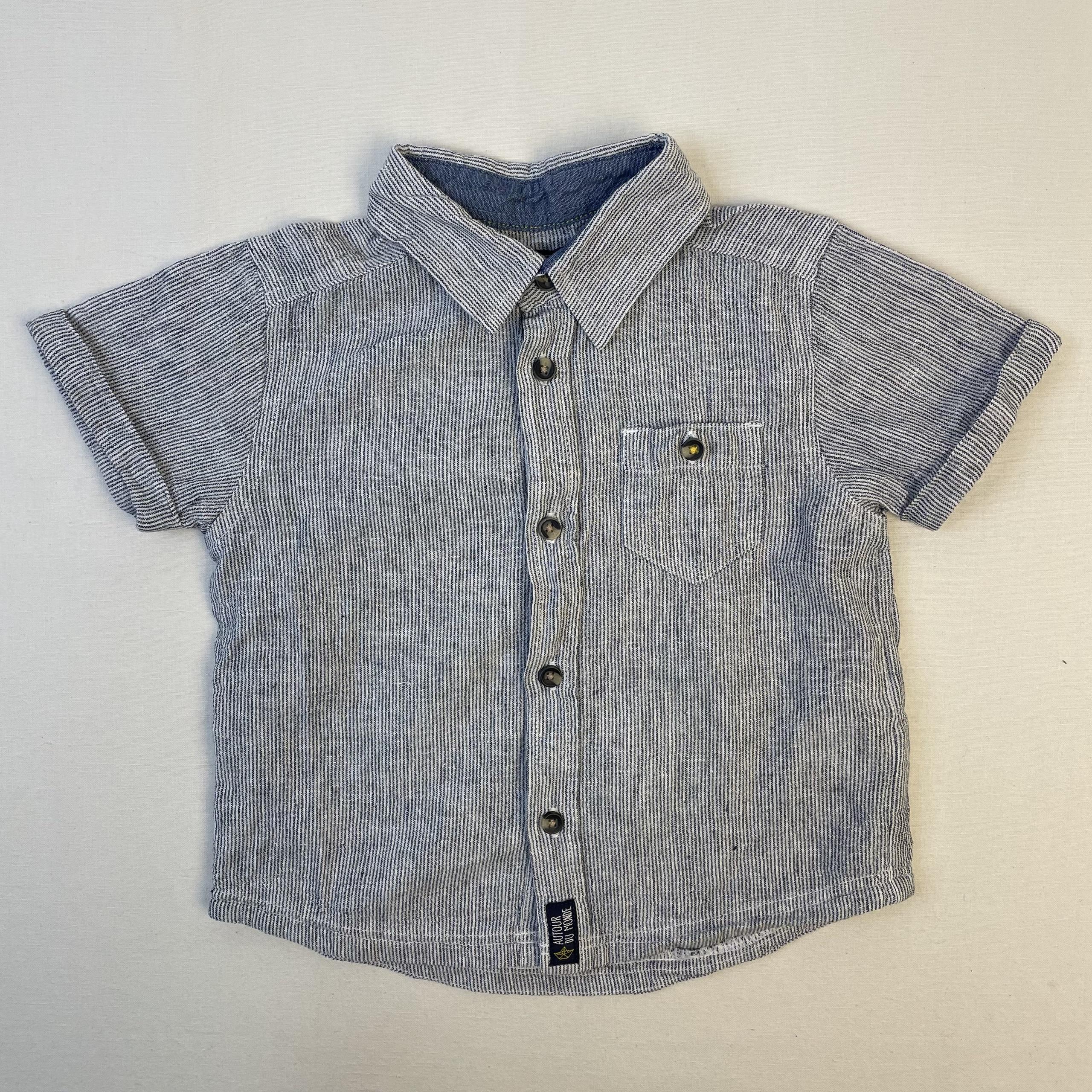 - Chemise à manches courtes blanche à rayures bleues avec une poche au niveau de la poitrine et fermeture devant par des boutons classiques noirs.