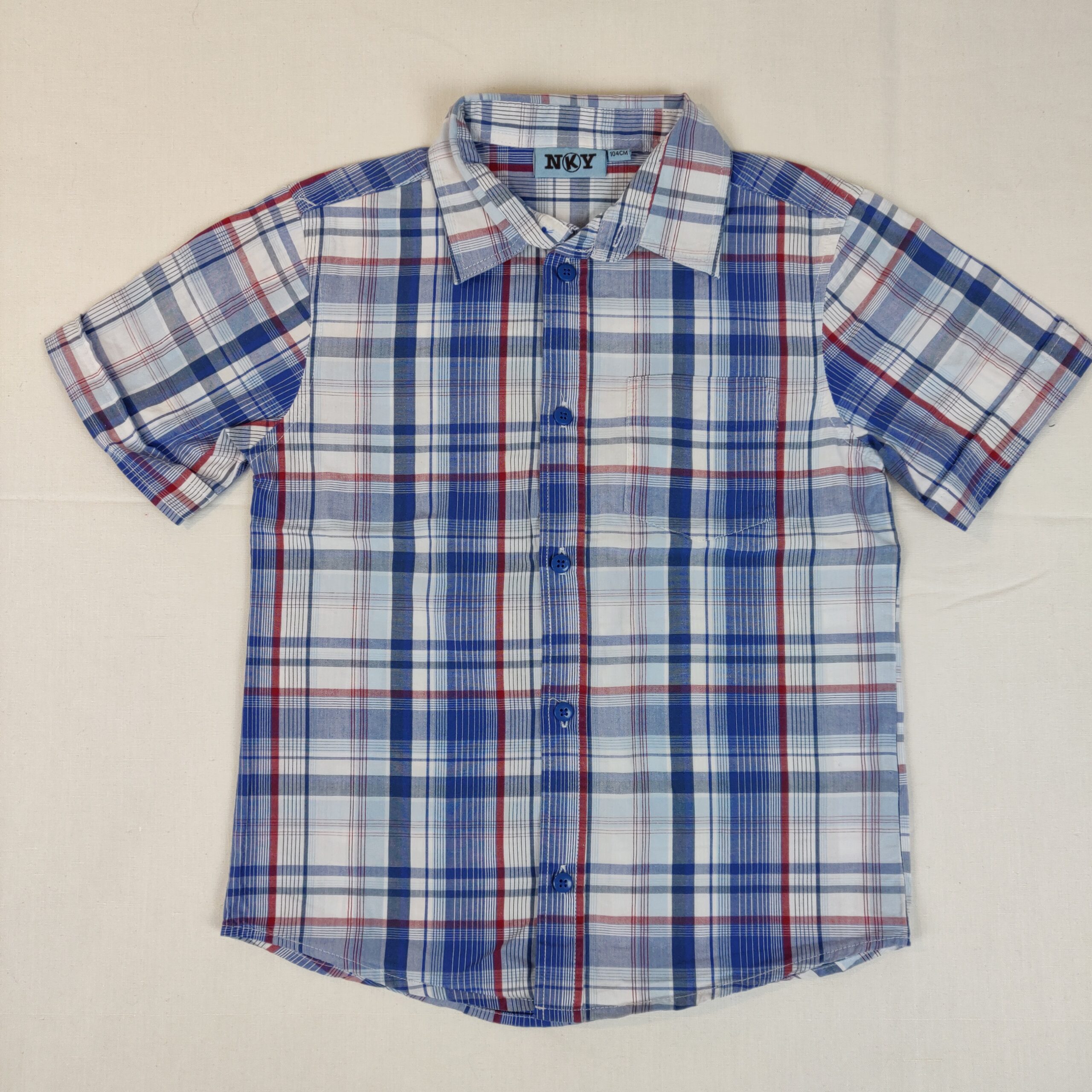 Autres commentaires : Chemise à manches courtes à quadrillage – Bleu, blanc et rouge – col classique. Poche sur la poitrine. Fermeture centrale à boutons classiques bleus.