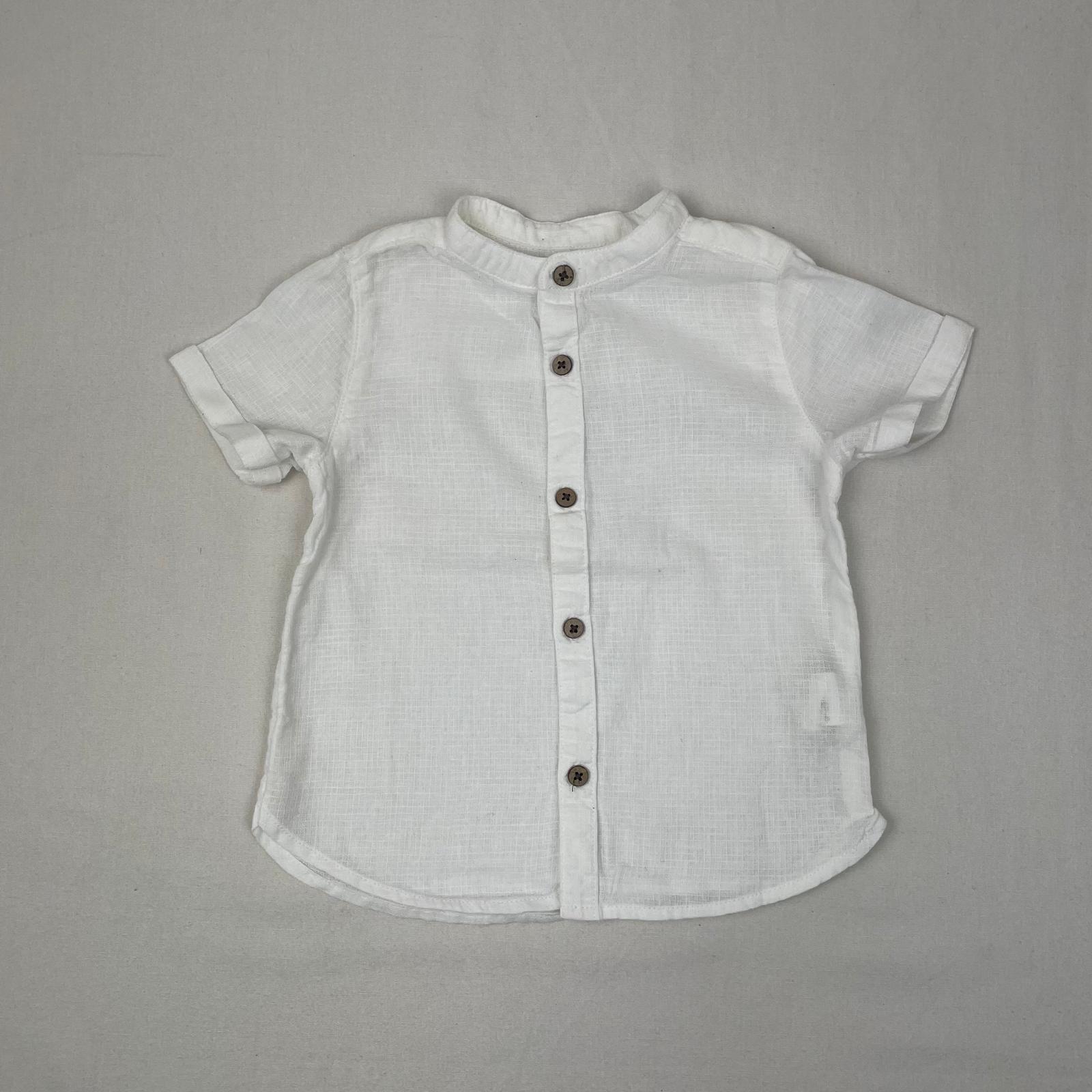 Autres commentaires : Chemise manches courtes, col rond, 45% lin, fermeture devant par boutons, poignets retroussés, il y a une broderie à la dos.
