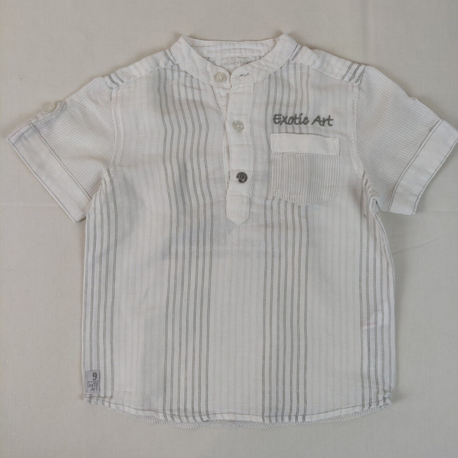 Autres commentaires : 40% coton. Chemise manches courtes – blanches à fines rayures verticales gris clair et gris foncé. Ouverture centrale à partir du col à 3 boutons classiques. Une pochette centrale. Motif maison sur pilotos au dos avec inscription « Naive art summer code ».