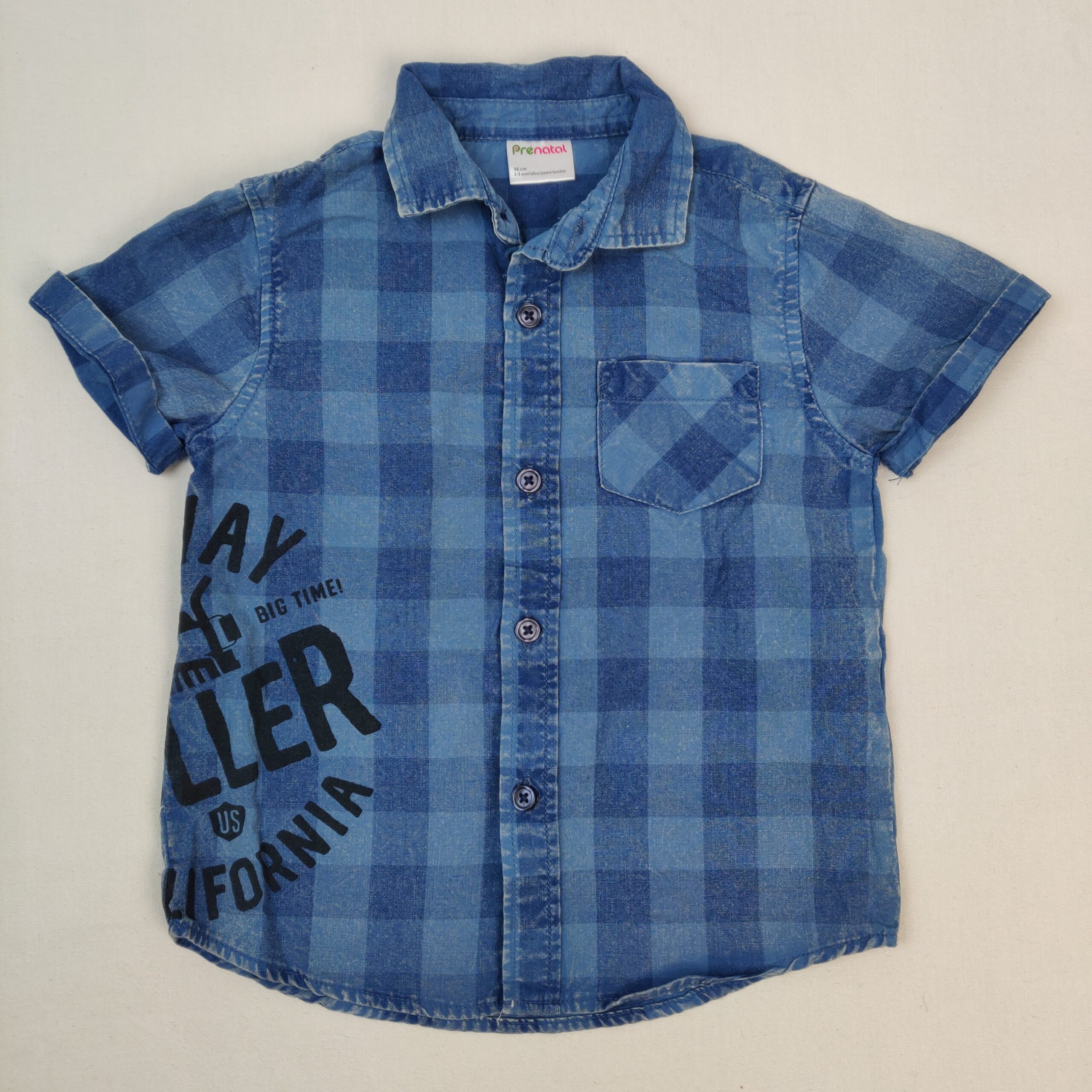 Autres commentaires : Chemise manches courtes à carreaux bleu foncé et bleu jeans, inscritptions en noir « HIGHWAY » et « California »sur le côté droit, fermeture par boutons.