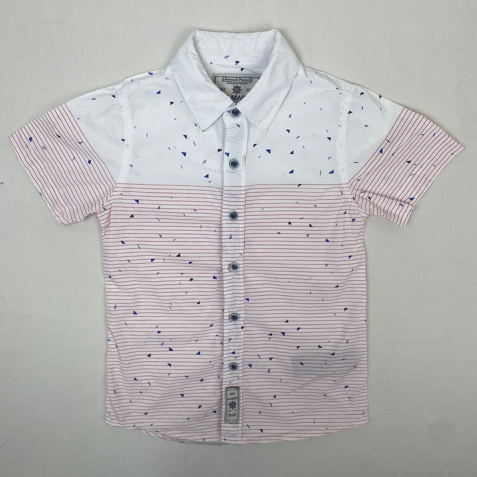 Autres commentaires : Chemise blanche à manches courtes avec des lignes rouges et des motifs bleus en forme de triangles, col chemise.