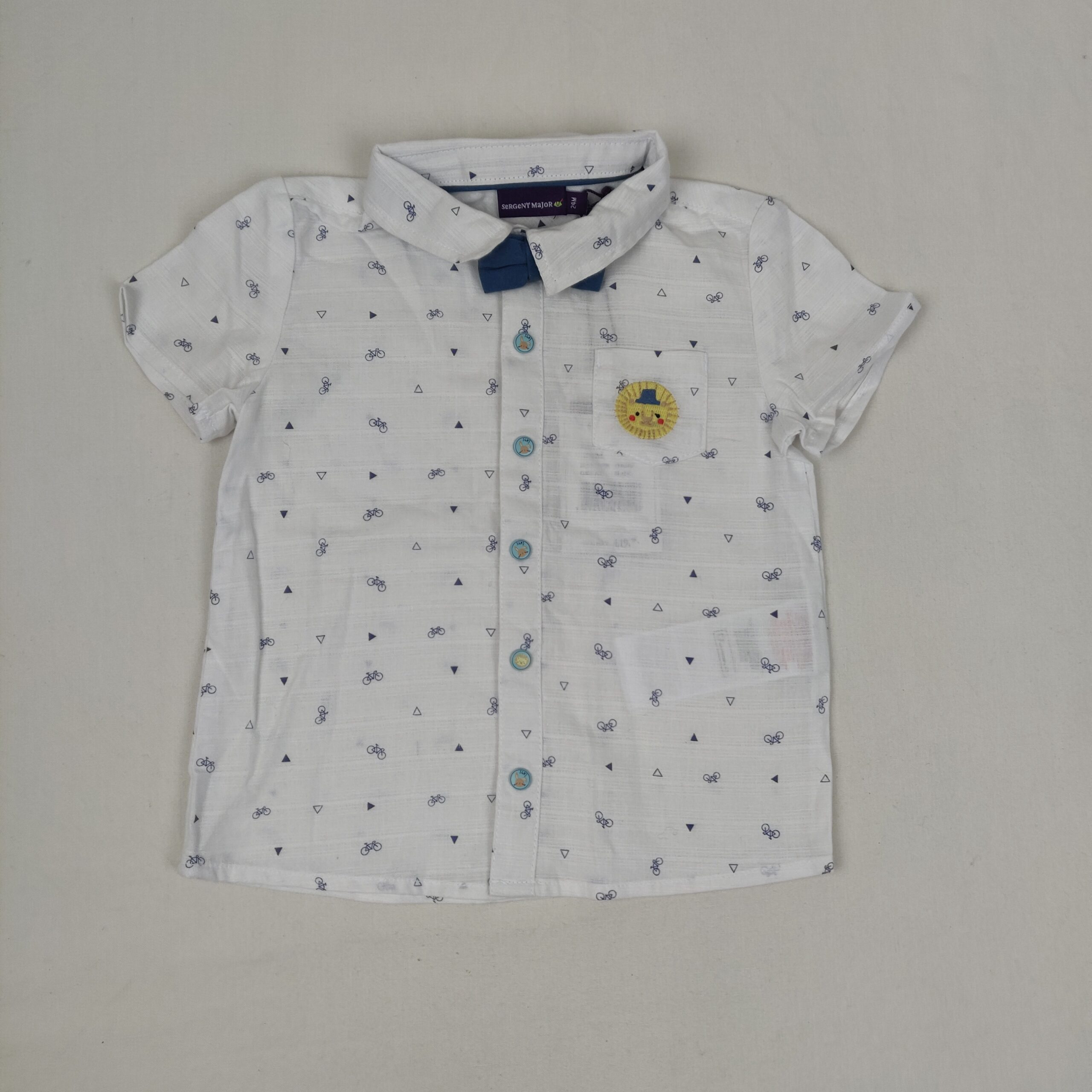 Autres commentaires : Chemisette blanche avec des motifs mini vélos bleus et noeud papillon bleu amovible à scratch – jolis boutons pression bleu clair à motifs animaux. Parfait pour occasion spéciale