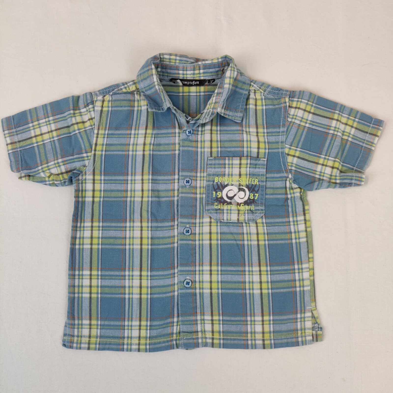 Autres commentaires : Chemise à manches courtes à motif écossais bleu, jaune, bleu marine, orange, blanc. Pochette centrale accompagnée de l’inscription « Border surfer 1987 California Sport3 ». Ouverture centrale à boutons.