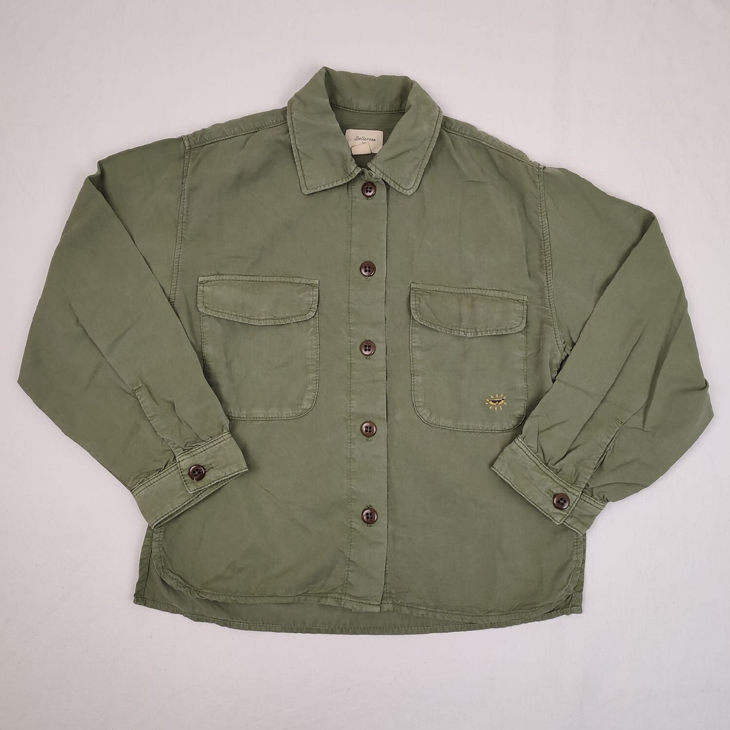 Autres commentaires : 35% Coton. Chemise manches longues vert kaki, col chemise, fermeture devant par boutons.