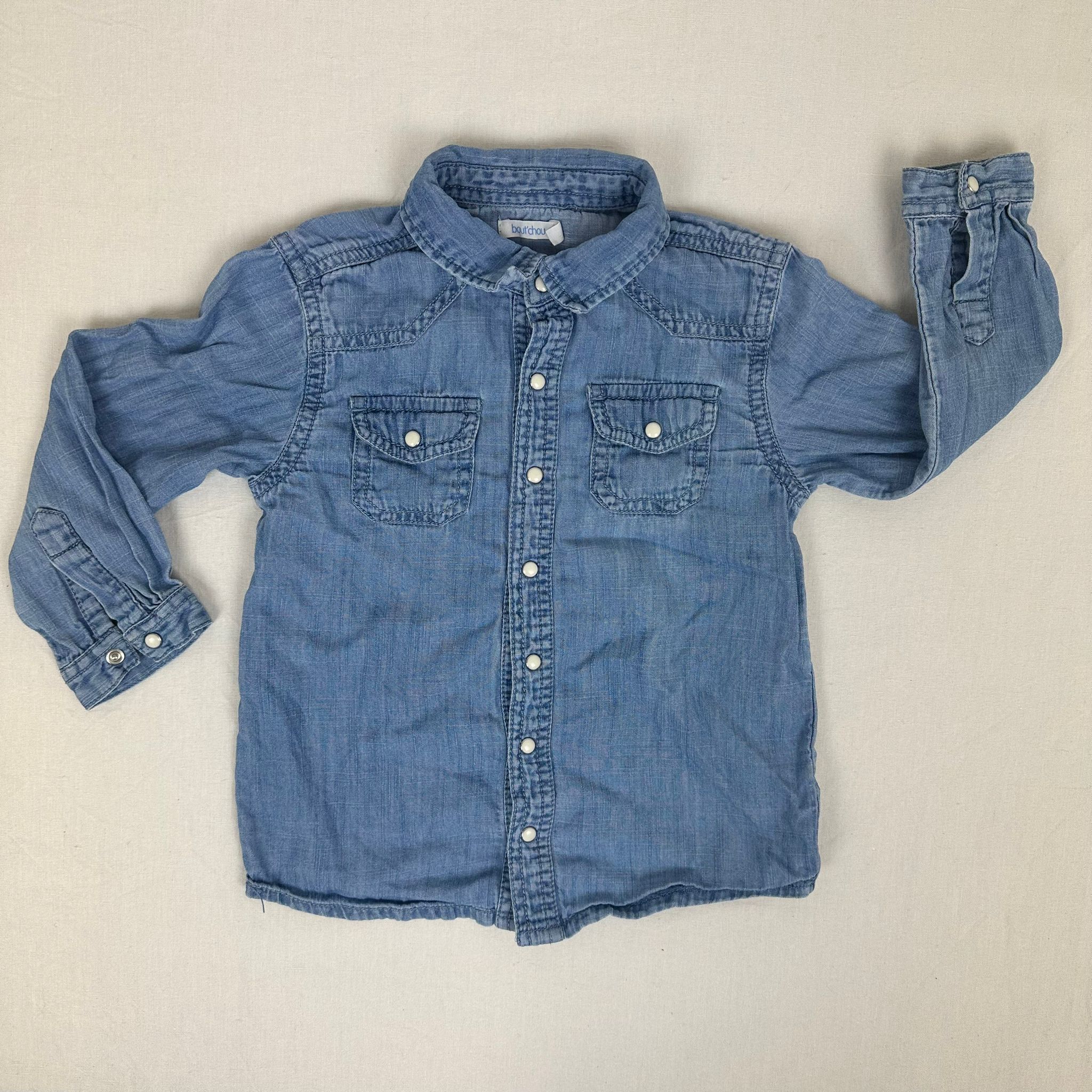 Autres commentaires : Chemise manches longues bleu avec tissu jean légèr, 2 poches latéraux et une fermeture par boutons pressions.