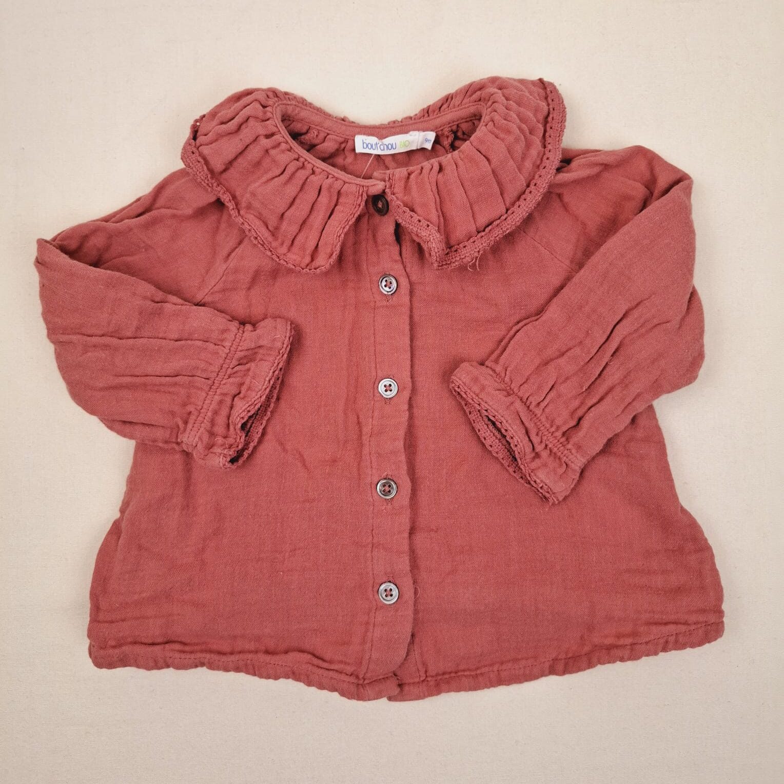 Autres commentaires : Blouse rose foncé à manches longues, col claudine, finition broderie anglaise, double gaze de coton, poignets élastiqués volantés, fermeture devant par boutons. Collection Bio.