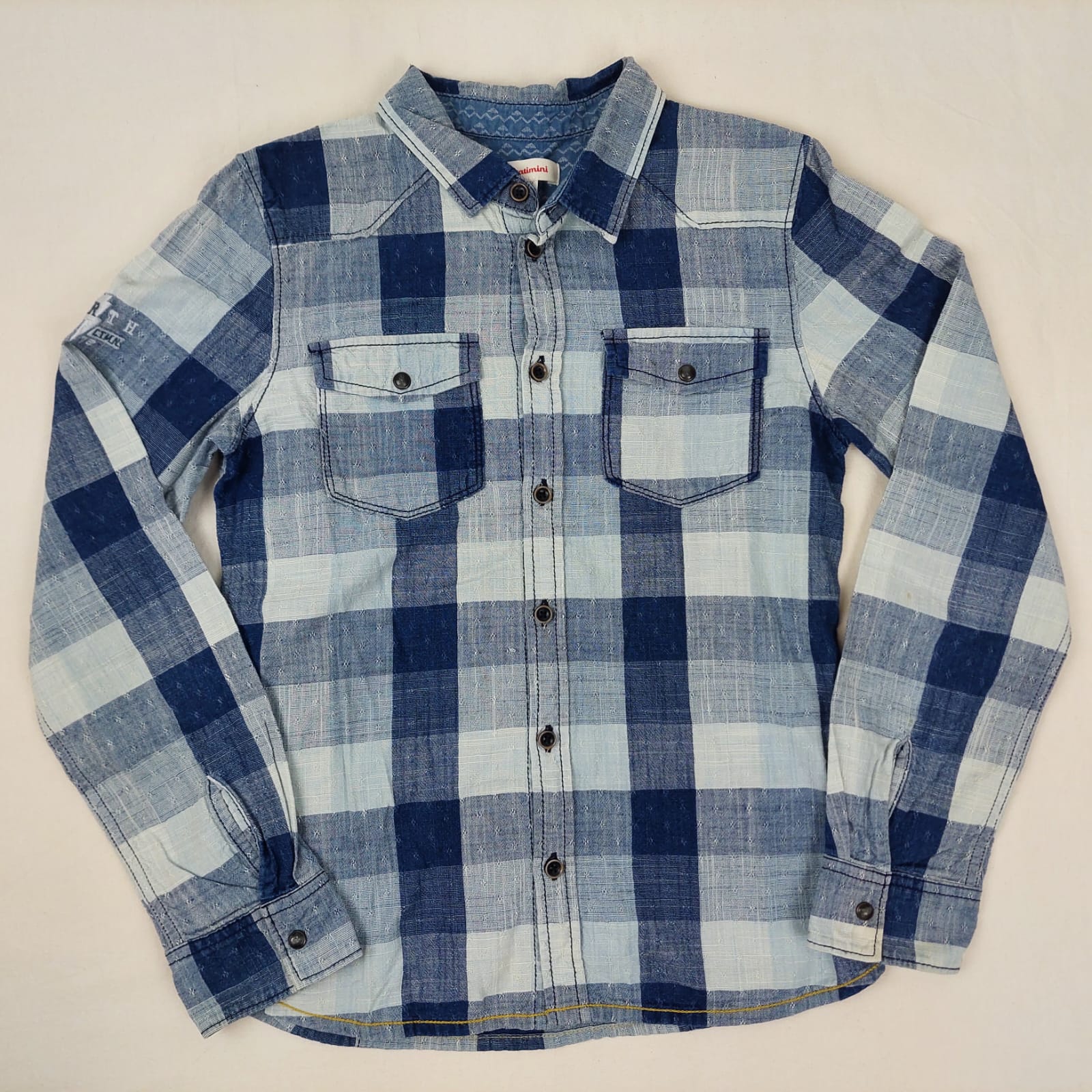 Autres commentaires : Chemise manches longues à carreau bleu et bleu clair, col français, petitte tache sur la manche gauche