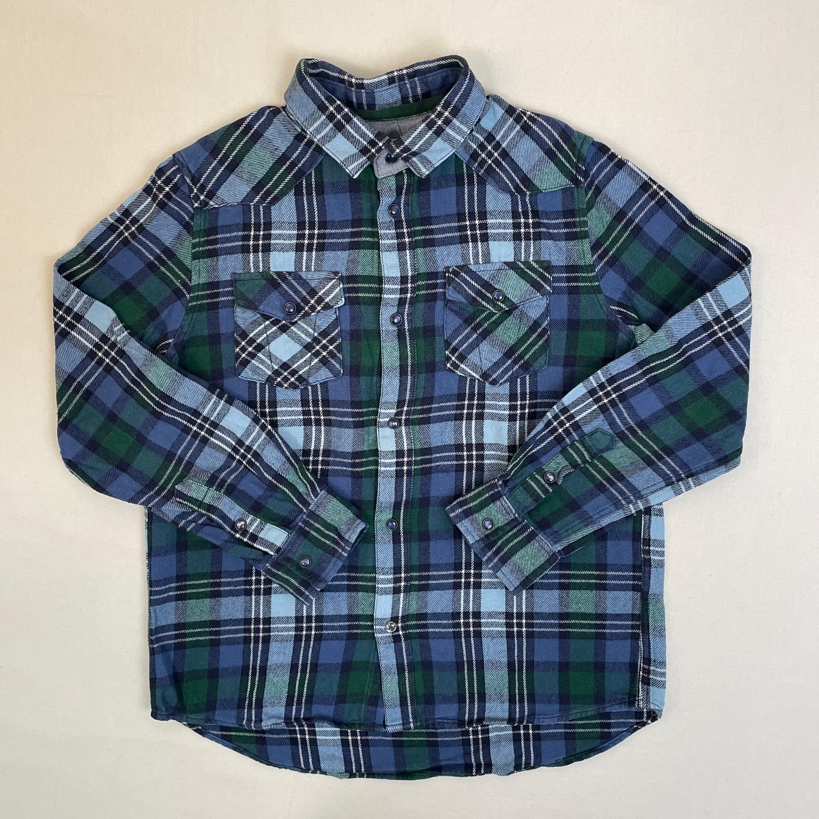 Chemise manches longues à carreaux, fermeture par boutons classiques.