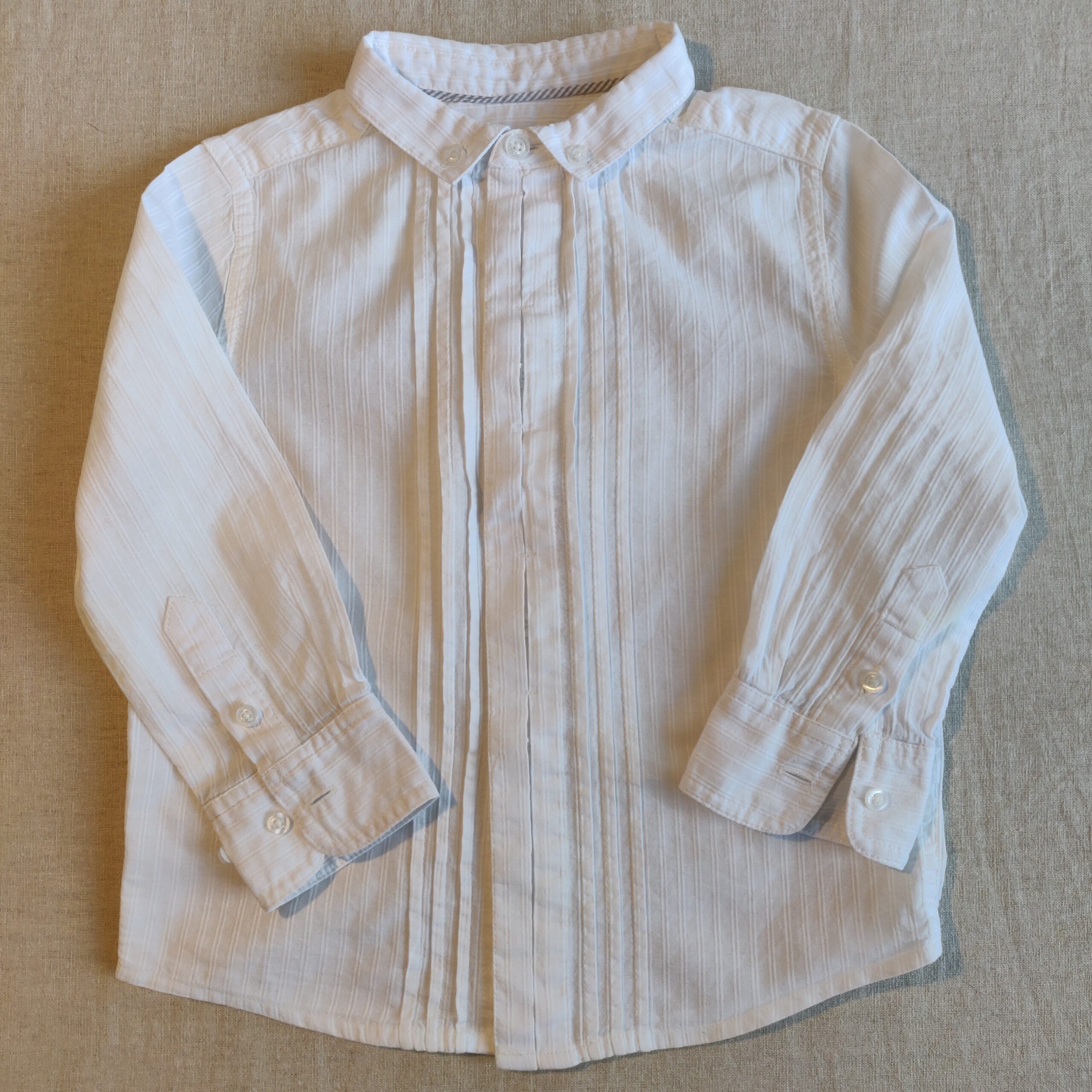 Autres commentaires : Chemise à manches longues, rayures blanc sur blanc, boutons cachés par un revers. Petite tâche jaune derrière la mahce gauche.