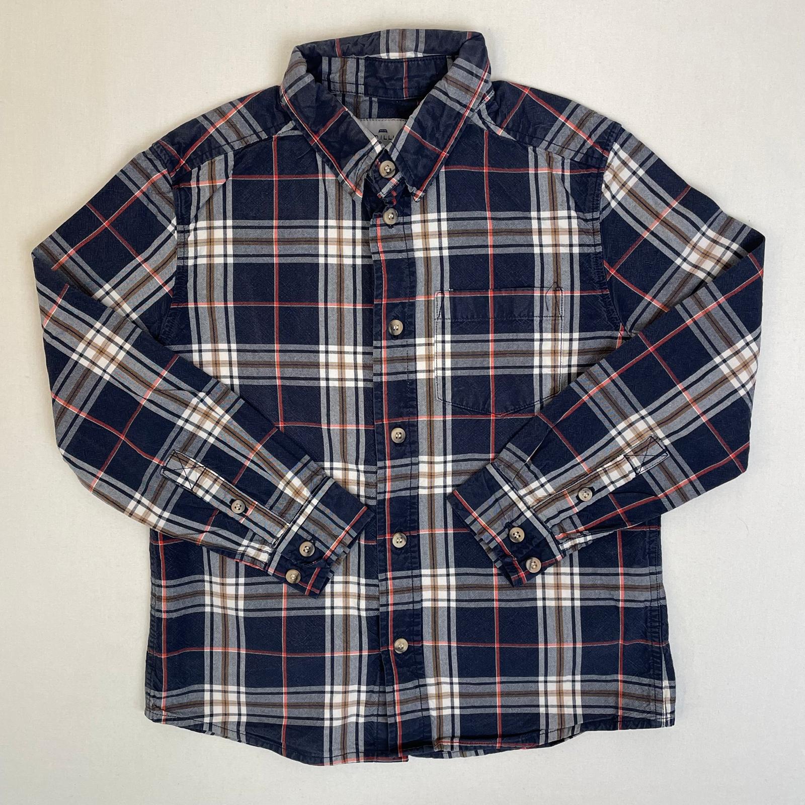 Chemise manches longues bleu foncé à carreaux, fermeture par boutons classiques.