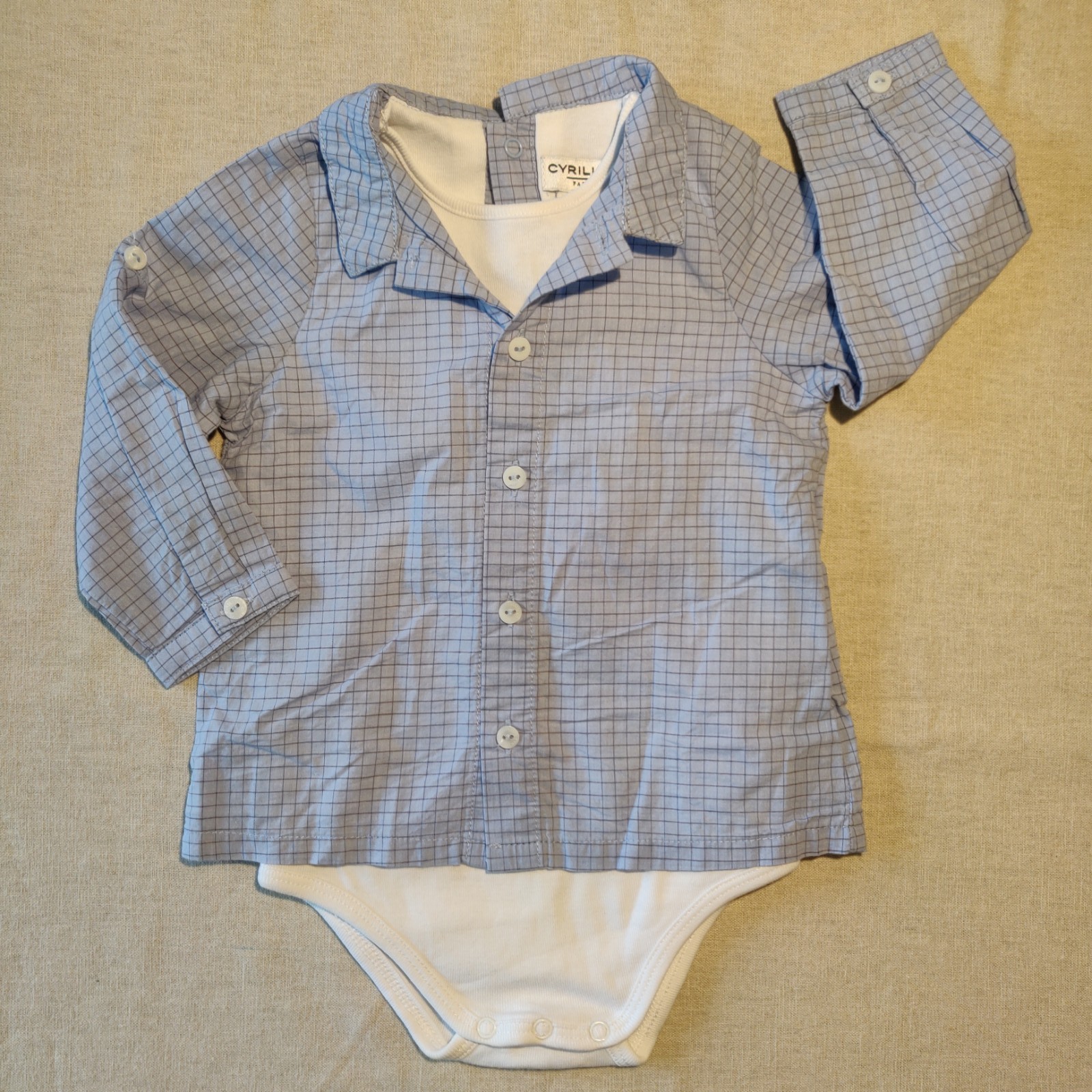 Autres commentaires : Chemise-body manches longues : bleu clair à carreaux formés de lignes bleu foncé et noires. A l’avant, boutons le long de la chemise pour décoration, fermeture à l’arrière par 4 boutons pression. Le body se ferme aussi à l’entrejambe par boutons pression.