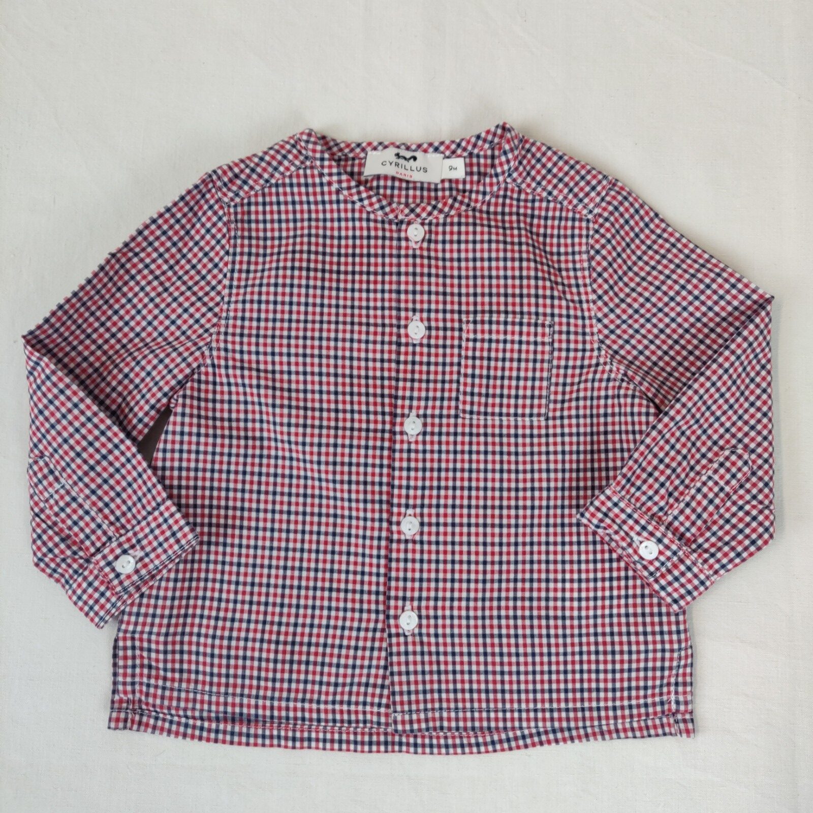 Autres commentaires : Chemise à manches longues à motifs à carreaux rouges, bleu marine et blancs. Une pochette centrale. Ouverture classique centrale à boutons.