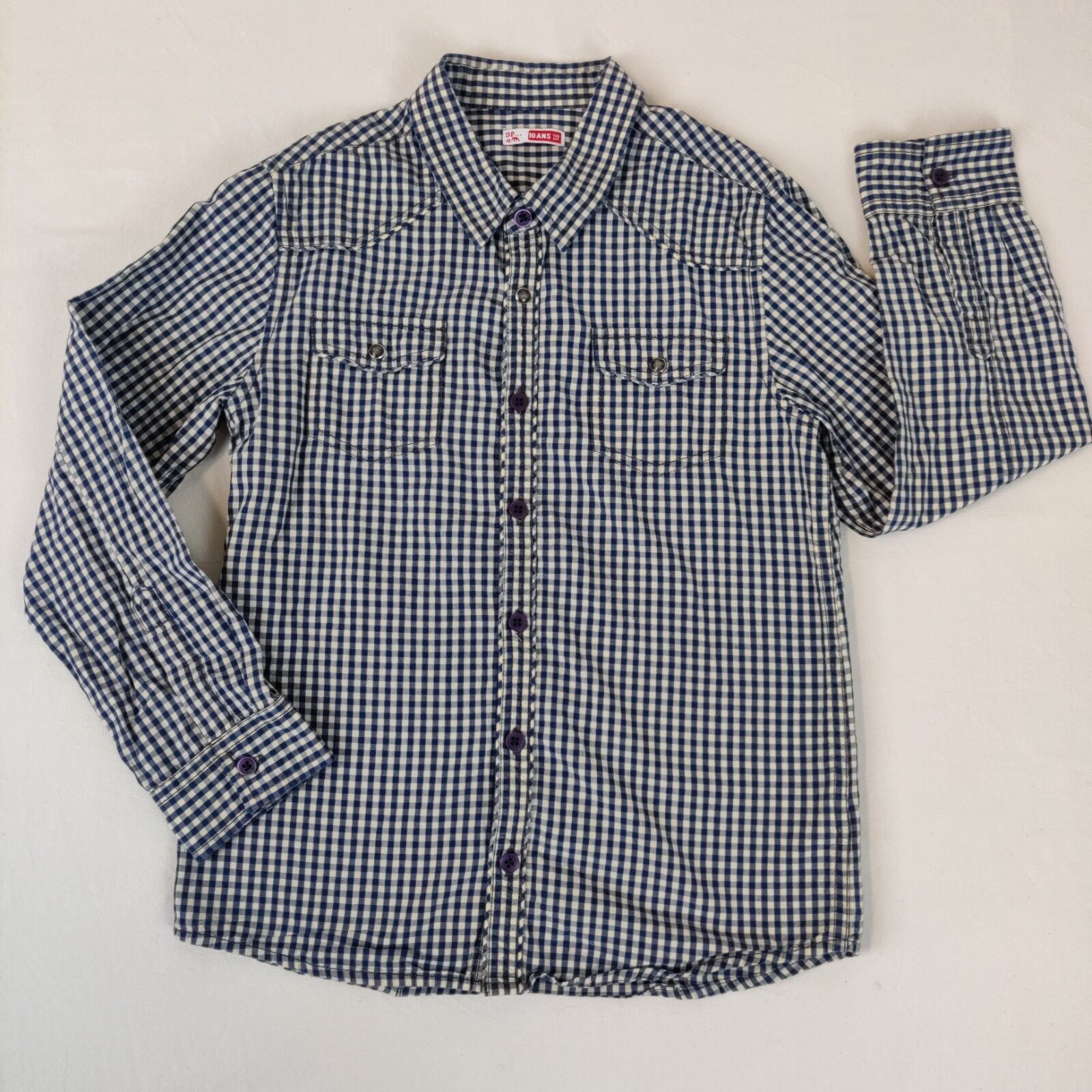 Autres commentaires : Chemise à manches longues cadrillée bleu et blanc. Boutons de chemise violet