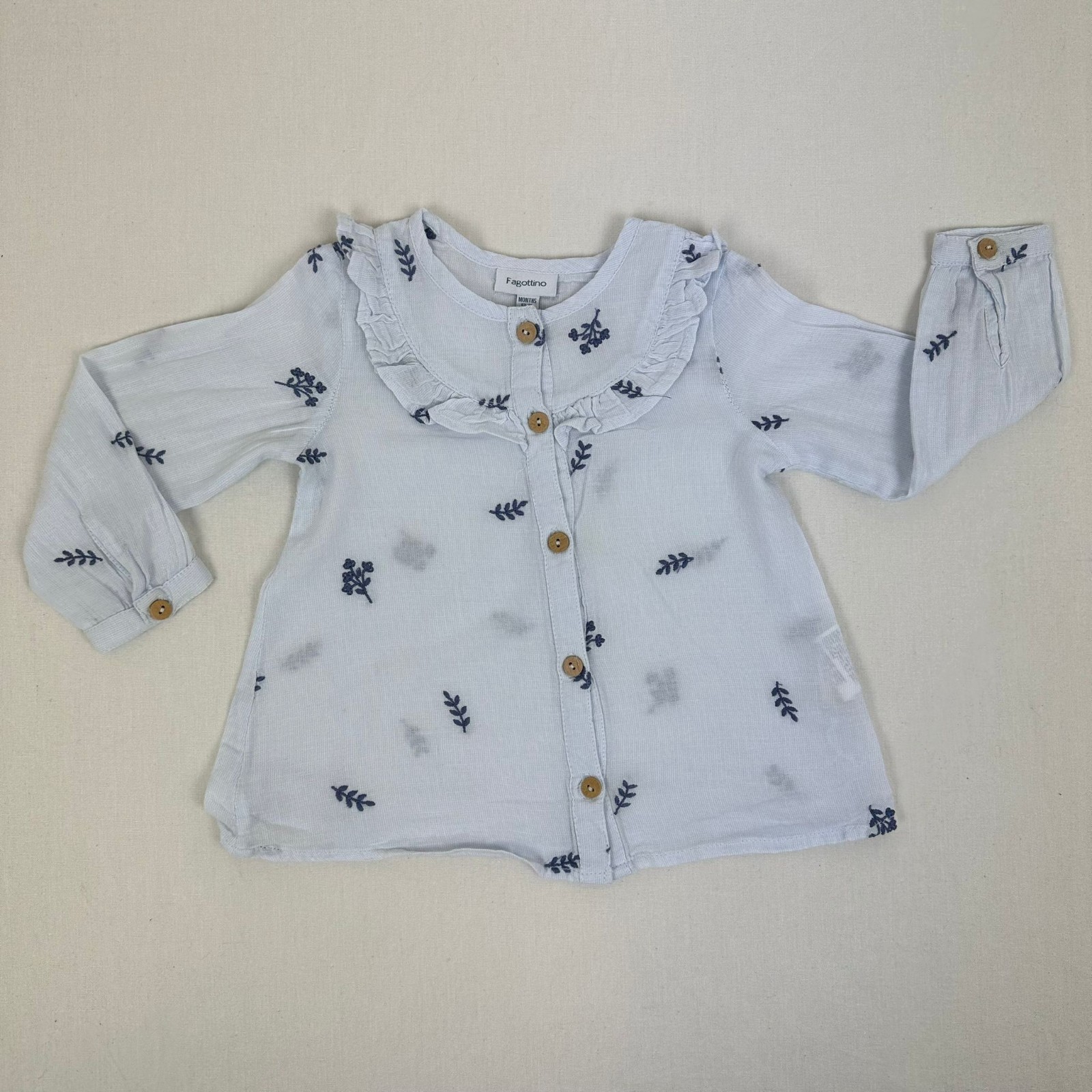 Autres commentaires : Chemise manches longues bleu avec col rond et le bas en collerette avec une fermeture par boutons.