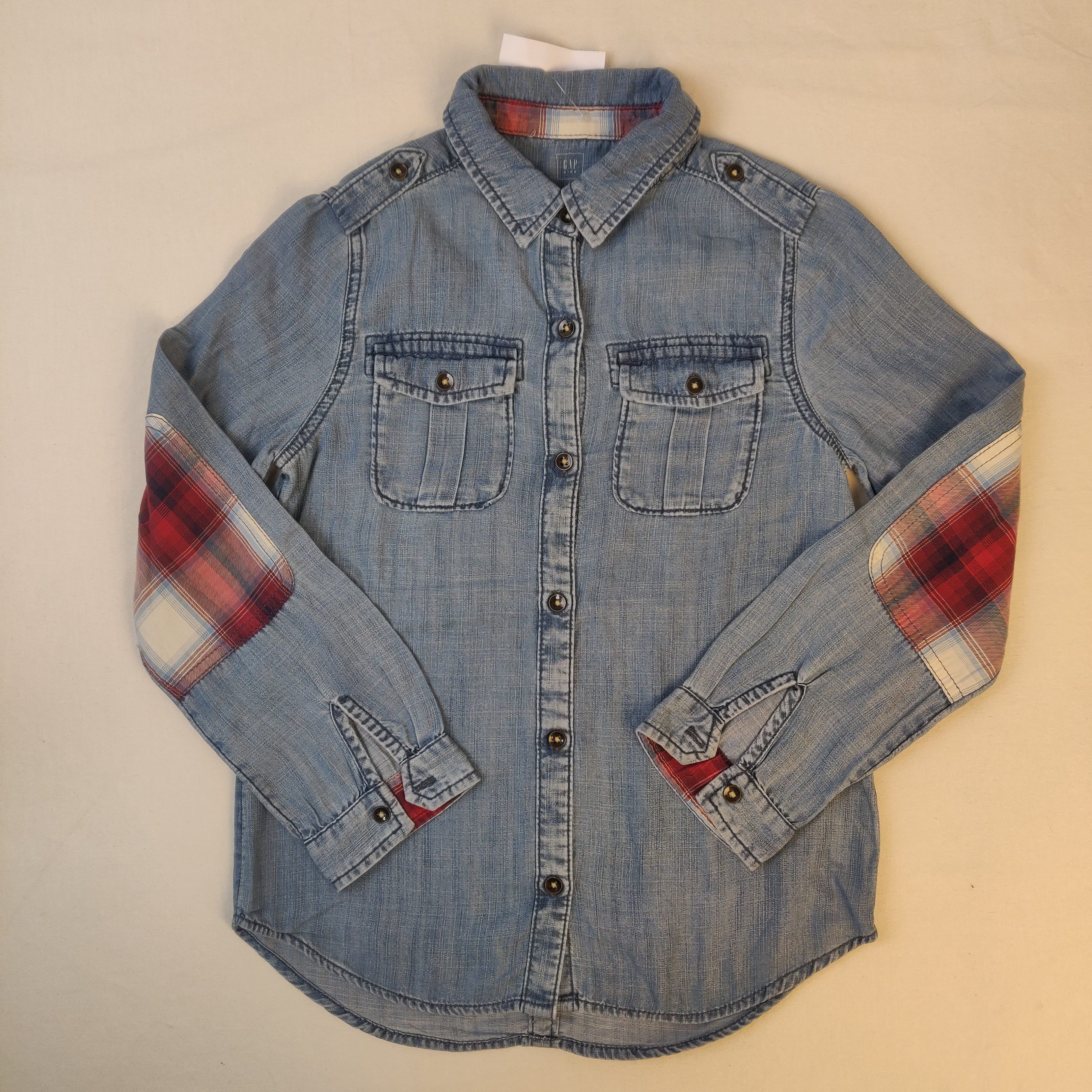 - Chemise manches longues en denim bleu léger, coudières et intérieur du col en tissu à carreaux bleus, blancs et rouges, fermeture devant par boutons classiques.