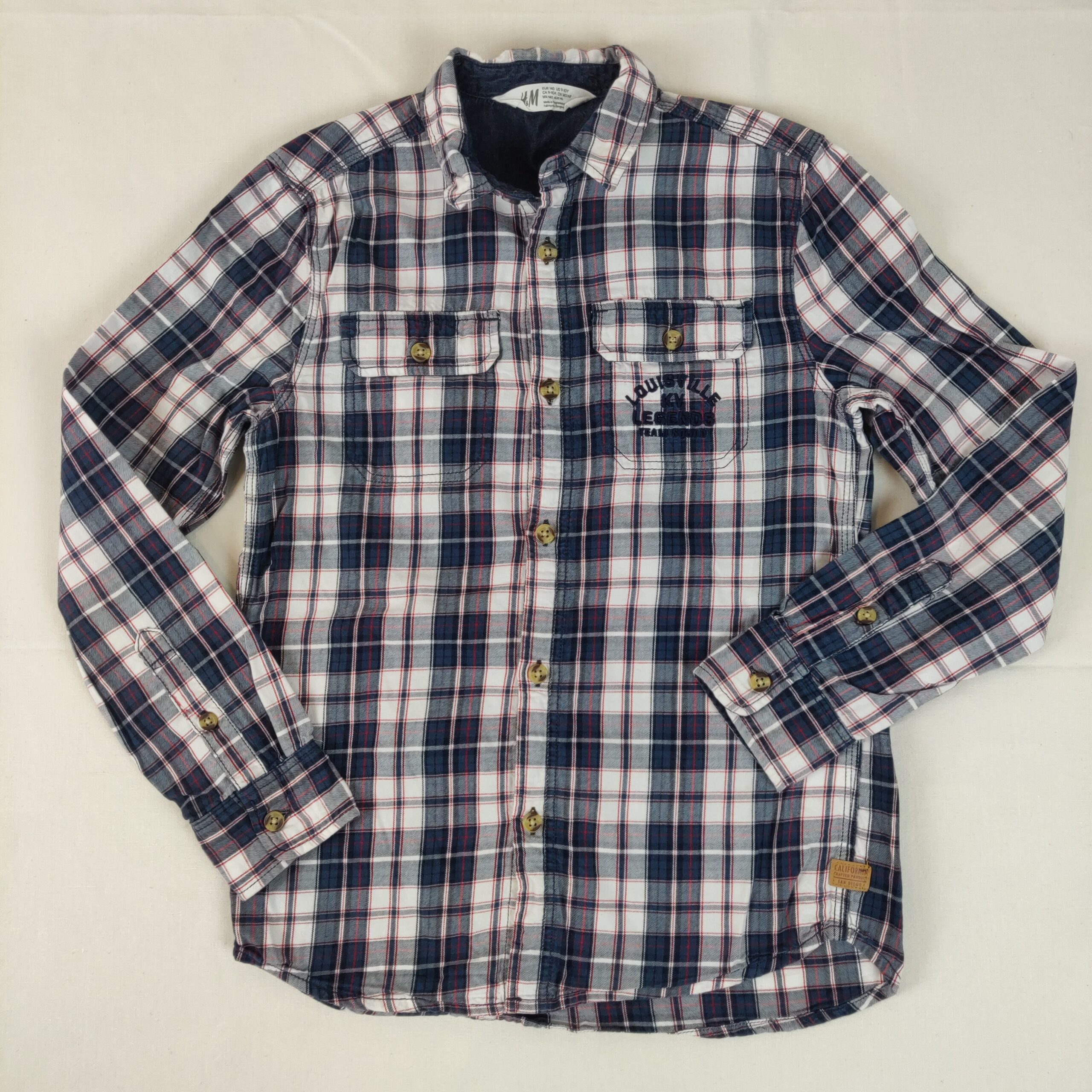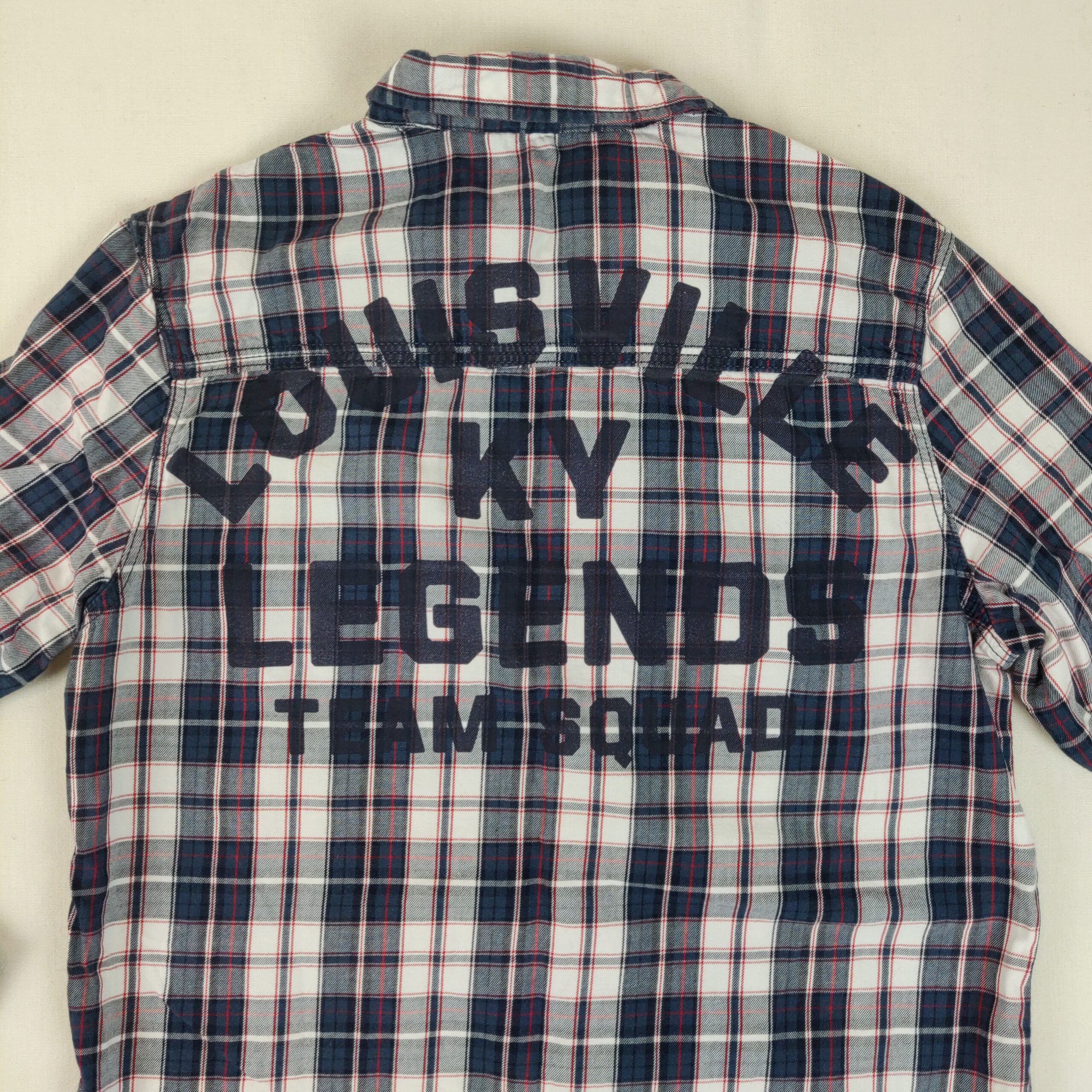 Autres commentaires : Chemise bleu foncé à carreaux blancs et lignes rouges, inscription bleu marine dans le dos Louisville Legends.