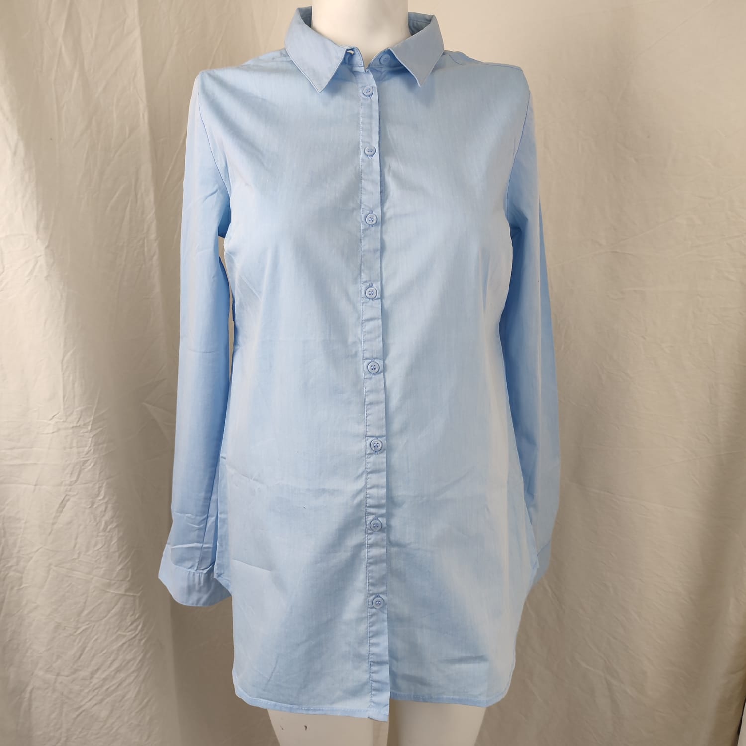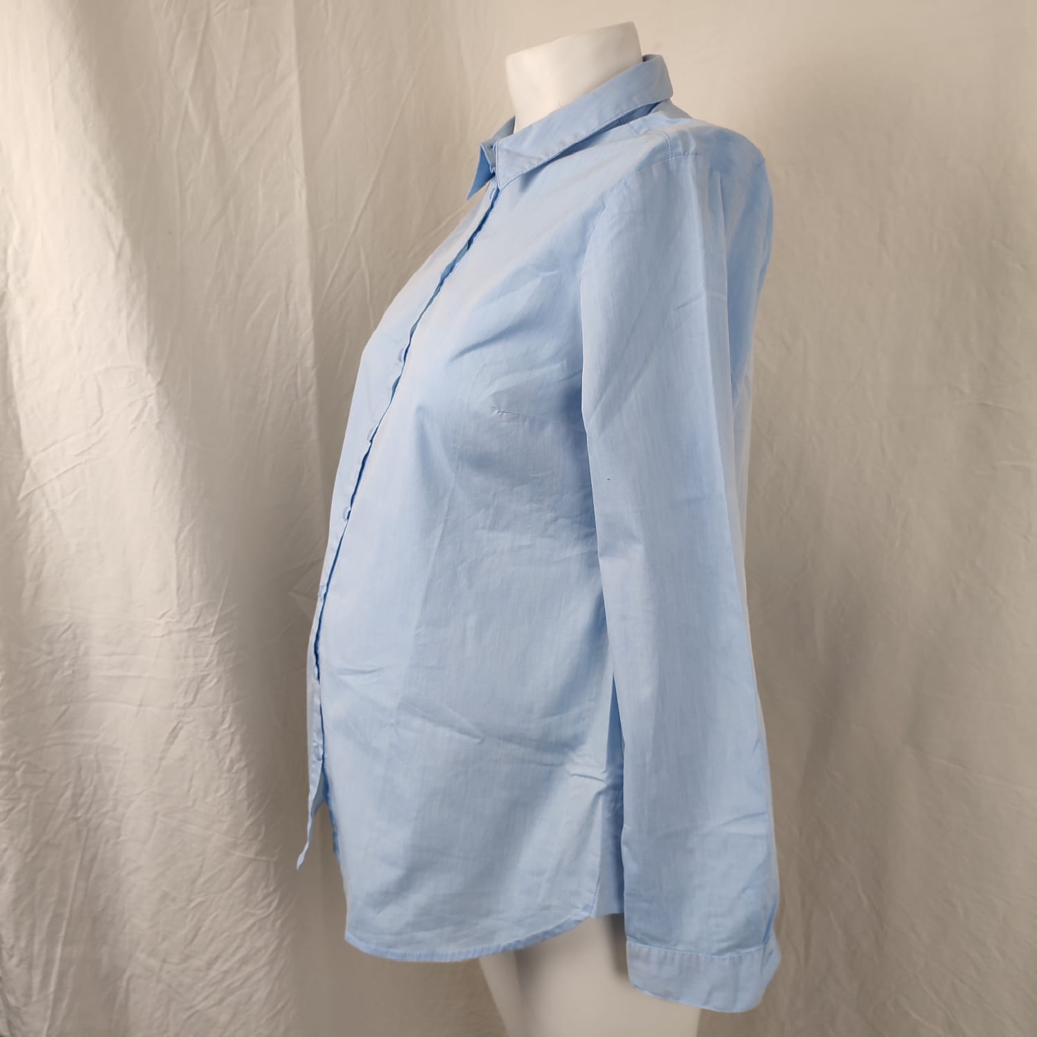 Autres commentaires : 30% polyamide et 3% élasthanne. Chemise bleu clair à manches longues, taille réglable par 3 boutons sur les côtés. Taille M.