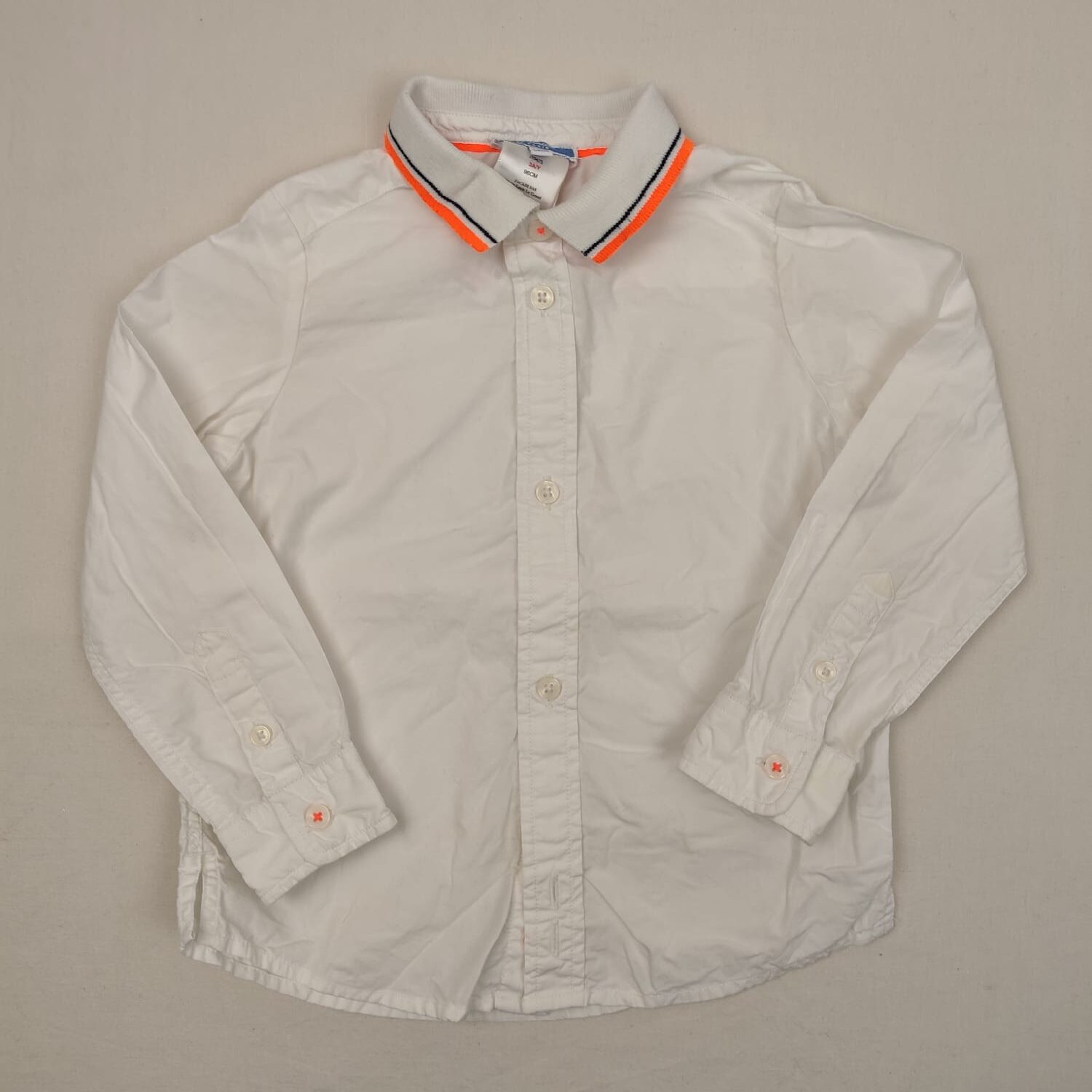 Autres commentaires : Chemise manches longues blanche sur col polo blanc avec lignes noir et orange fluo, fermeture devant et poignets par boutons.