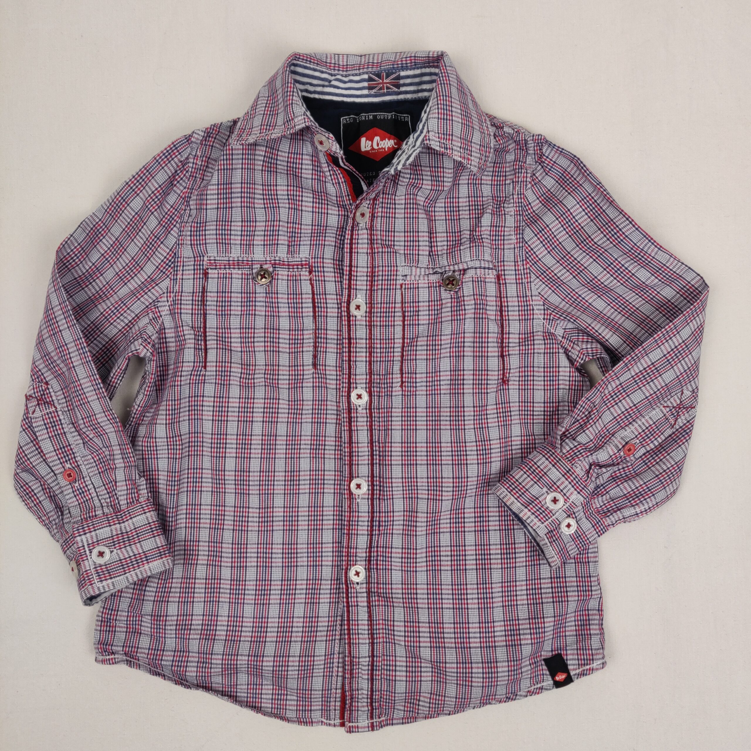 Autres commentaires : Chemise manches longues, motif écossais rouge, bleu et blanc, fermeture devant par petits boutons, inscription en relief bleu marine « The Spirit Quality » au dos.