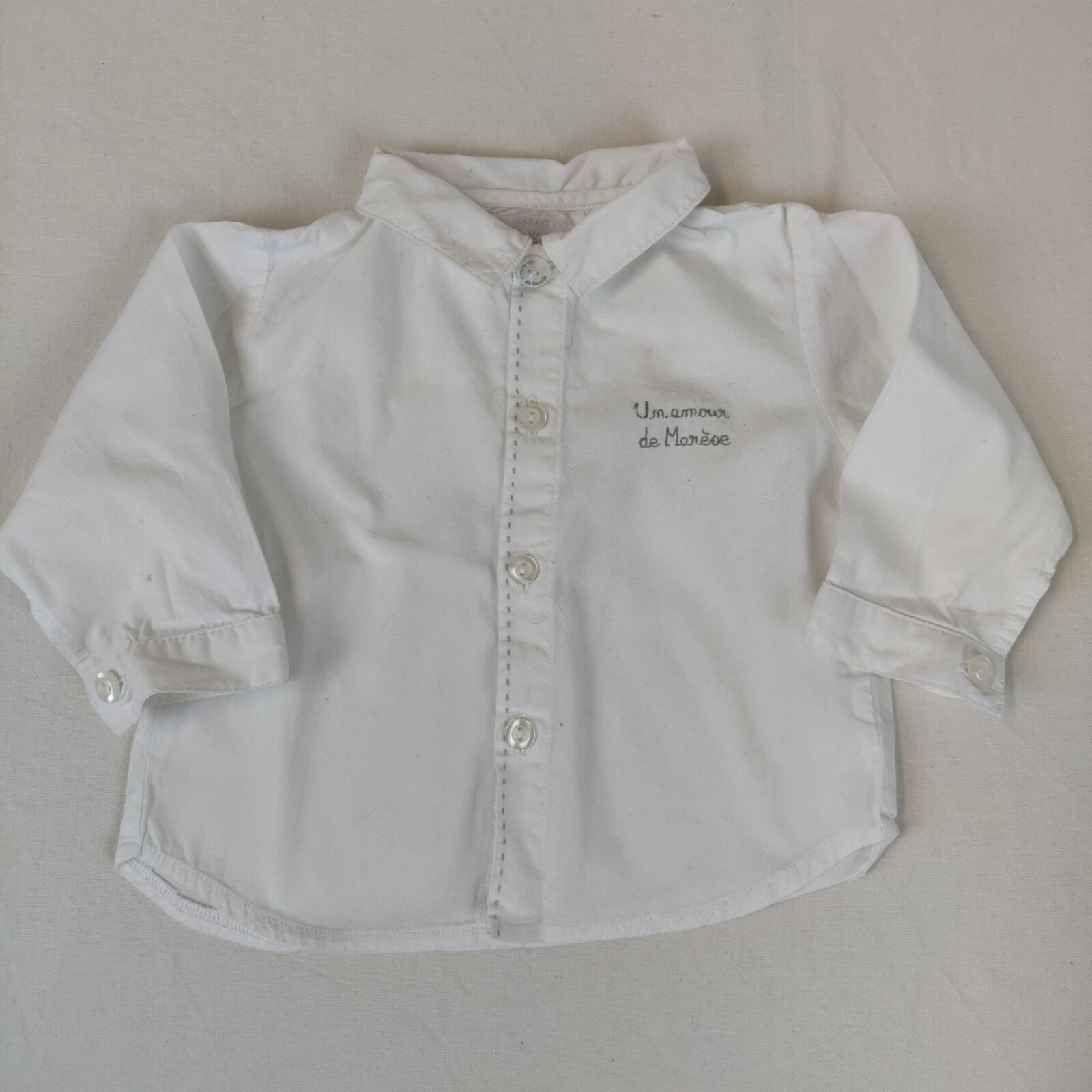 Autres commentaires : Chemise manches longues blanche, liseré gris le long de la boutonnière et broderie « un amour de Marèse » au coeur.